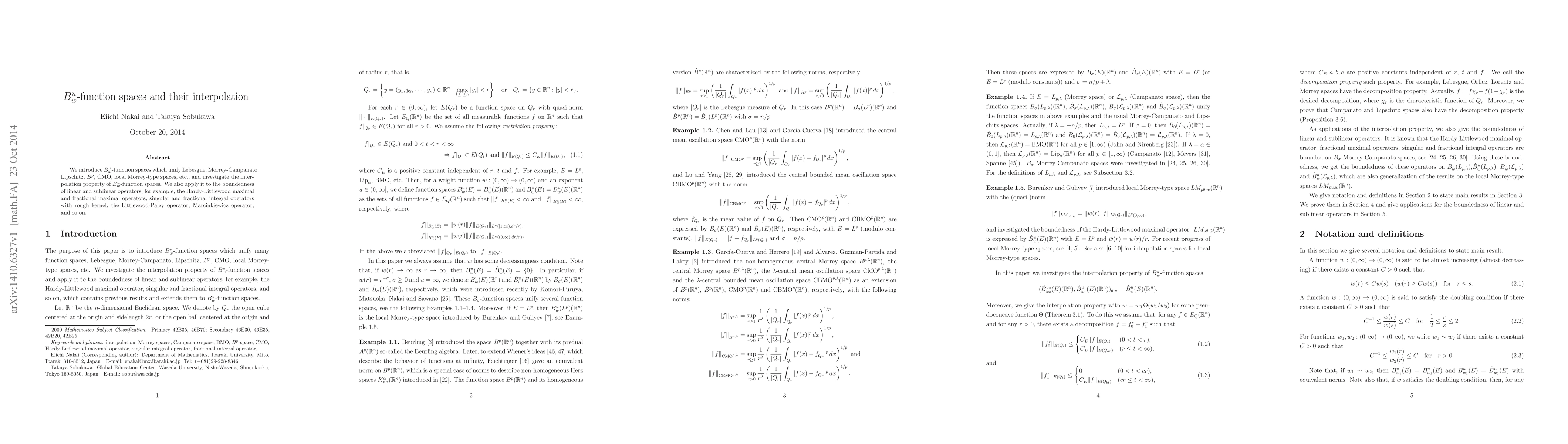 We introduce $B_w^u$-function spaces which unify Lebesgue, Morrey-Campanato, Lipschitz, $B^p$, CMO, local Morrey-type spaces, etc., and investigate the interpolation property of $B_w^u$-function spaces. We also apply it to the boundedness of linear and sublinear operators, for example, the Hardy-Littlewood maximal and fractional maximal operators, singular and fractional integral operators with rough kernel, the Littlewood-Paley operator, Marcinkiewicz operator, and so on.
