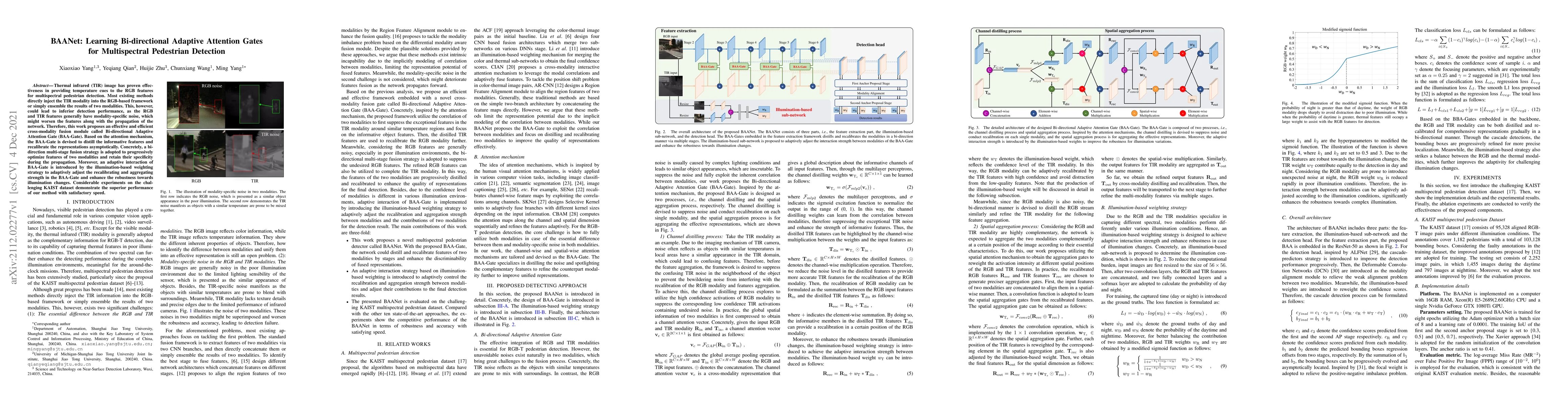 Thermal infrared (TIR) image has proven effectiveness in providing temperature cues to the RGB features for multispectral pedestrian detection. Most existing methods directly inject the TIR modality into the RGB-based framework or simply ensemble the results of two modalities. This, however, could lead to inferior detection performance, as the RGB and TIR features generally have modality-specific noise, which might worsen the features along with the propagation of the network. Therefore, this work proposes an effective and efficient cross-modality fusion module called Bi-directional Adaptive Attention Gate (BAA-Gate). Based on the attention mechanism, the BAA-Gate is devised to distill the informative features and recalibrate the representations asymptotically. Concretely, a bi-direction multi-stage fusion strategy is adopted to progressively optimize features of two modalities and retain their specificity during the propagation. Moreover, an adaptive interaction of BAA-Gate is introduced by the illumination-based weighting strategy to adaptively adjust the recalibrating and aggregating strength in the BAA-Gate and enhance the robustness towards illumination changes. Considerable experiments on the challenging KAIST dataset demonstrate the superior performance of our method with satisfactory speed.