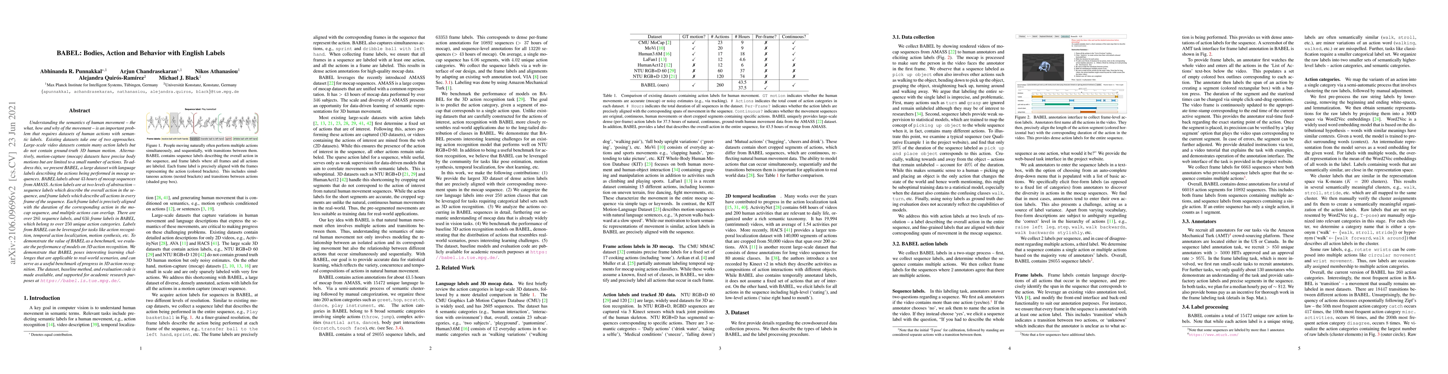 Understanding the semantics of human movement -- the what, how and why of the movement -- is an important problem that requires datasets of human actions with semantic labels. Existing datasets take one of two approaches. Large-scale video datasets contain many action labels but do not contain ground-truth 3D human motion. Alternatively, motion-capture (mocap) datasets have precise body motions but are limited to a small number of actions. To address this, we present BABEL, a large dataset with language labels describing the actions being performed in mocap sequences. BABEL consists of action labels for about 43 hours of mocap sequences from AMASS. Action labels are at two levels of abstraction -- sequence labels describe the overall action in the sequence, and frame labels describe all actions in every frame of the sequence. Each frame label is precisely aligned with the duration of the corresponding action in the mocap sequence, and multiple actions can overlap. There are over 28k sequence labels, and 63k frame labels in BABEL, which belong to over 250 unique action categories. Labels from BABEL can be leveraged for tasks like action recognition, temporal action localization, motion synthesis, etc. To demonstrate the value of BABEL as a benchmark, we evaluate the performance of models on 3D action recognition. We demonstrate that BABEL poses interesting learning challenges that are applicable to real-world scenarios, and can serve as a useful benchmark of progress in 3D action recognition. The dataset, baseline method, and evaluation code is made available, and supported for academic research purposes at https://babel.is.tue.mpg.de/.