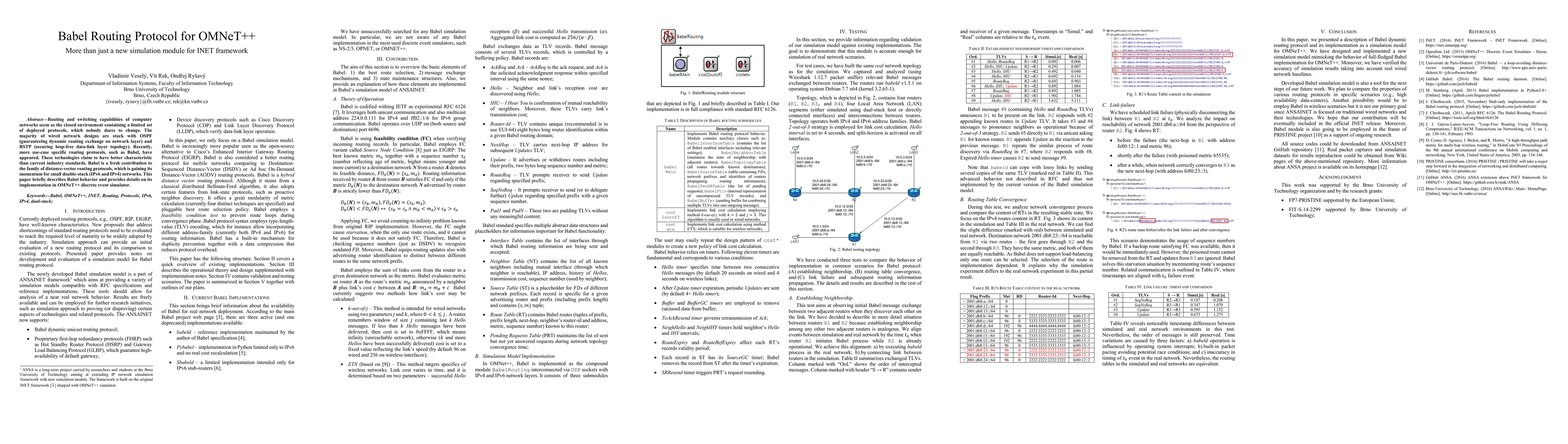 This paper introduces the Babel Routing Protocol within the OMNeT++ simulation framework, highlighting its potential advantages over traditional protocols like OSPF and RSTP. It details Babel's implementation in OMNeT++ and emphasizes its suitability for small dual-stack networks.