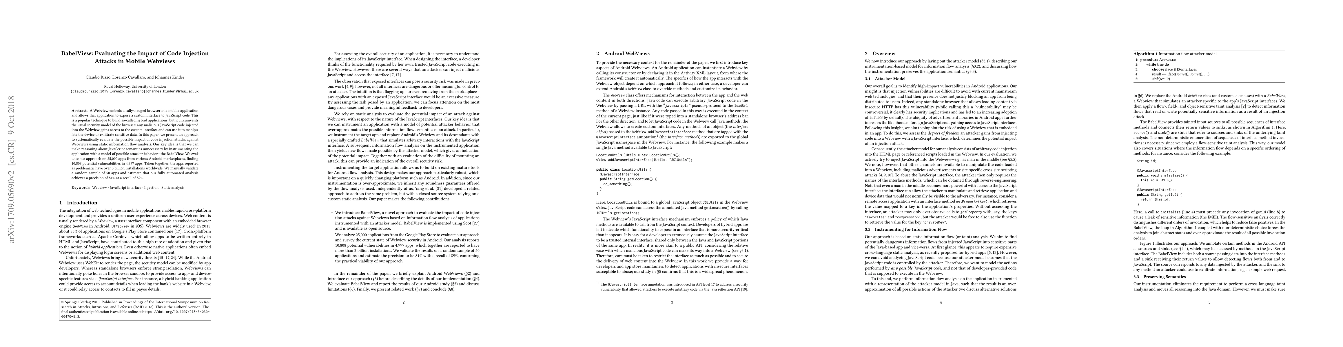 This paper introduces BabelView, a method for assessing code injection attacks in mobile Webviews using static information flow analysis. It finds 2,677 vulnerabilities in 1,663 apps from Android marketplaces, with an estimated precision of 90% and recall of 66% after manual validation.