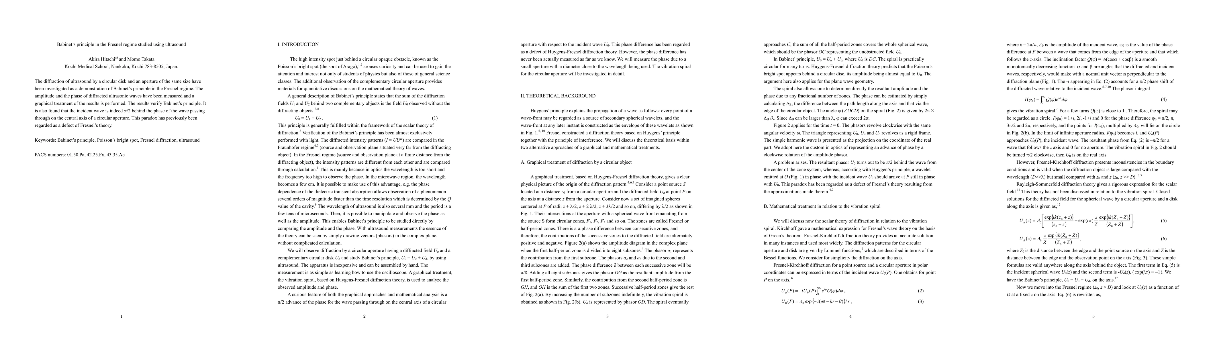 This study investigates the diffraction of ultrasound through a circular disk and an aperture to demonstrate Babinet's principle in the Fresnel regime, confirming its validity and resolving a previously noted paradox regarding phase relationships. The apparatus serves as a practical tool for science and engineering education.