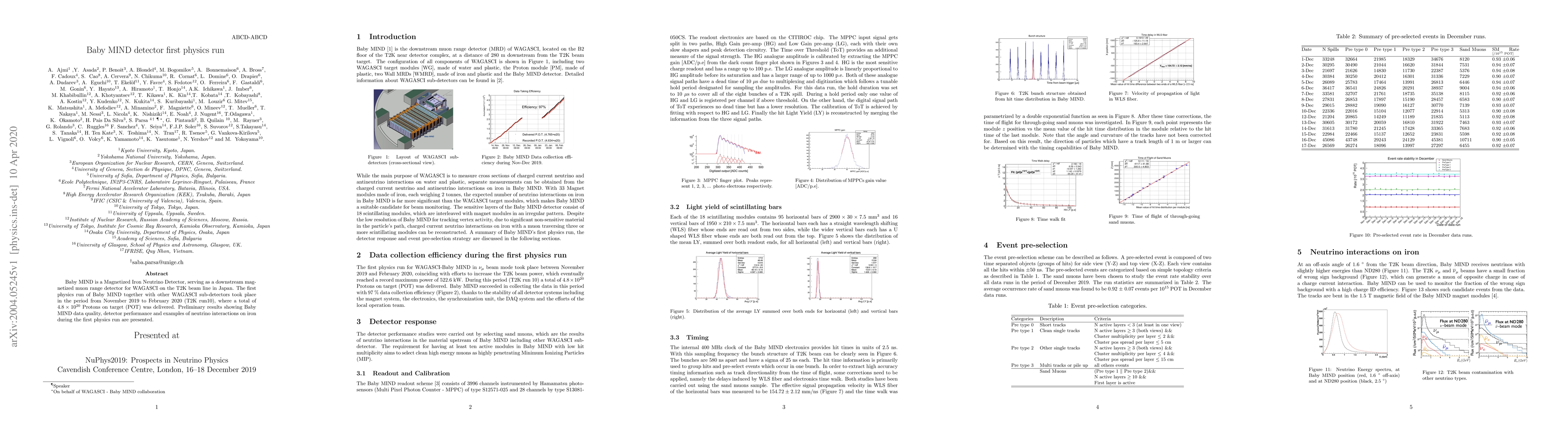 The Baby MIND detector, a magnetized iron neutrino detector, completed its first physics run in 2019-2020, delivering $4.8 imes 10^{20}$ Protons on target and showcasing promising data quality and performance.