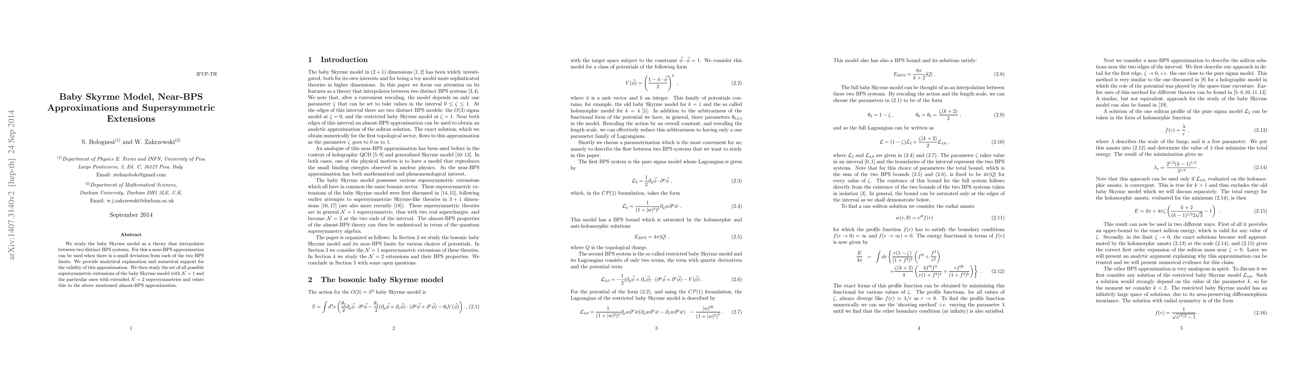 This paper investigates the baby Skyrme model, employing a near-BPS approximation to bridge two BPS systems, providing analytical and numerical validation. It further explores supersymmetric extensions, specifically ${\cal N}=1$ and ${\cal N}=2$, linking these to the near-BPS approximation.