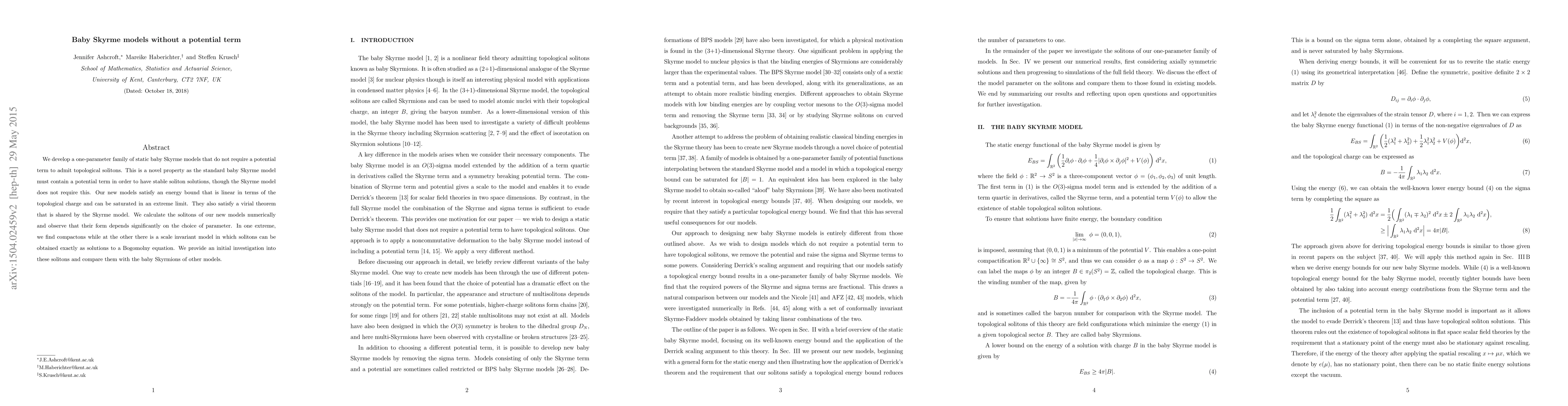 This paper introduces a novel one-parameter family of static baby Skyrme models that do not require a potential term for stable topological solitons, unlike the standard model. The new models satisfy linear energy bounds and a shared virial theorem with the Skyrme model, and their soliton forms vary significantly with parameter choice.