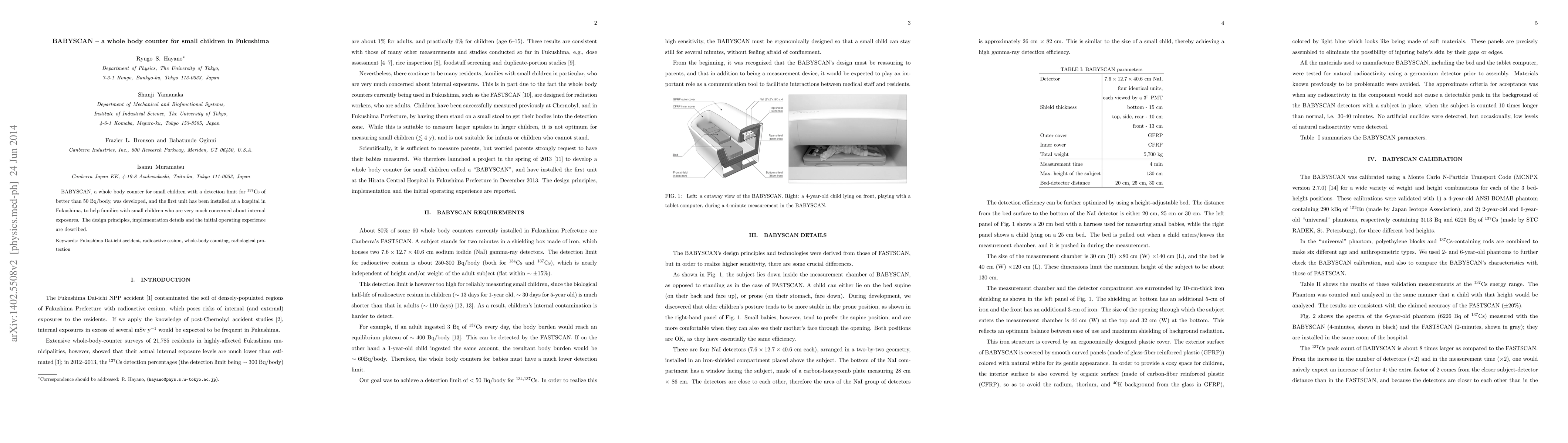 BABYSCAN, a whole body counter for small children with a detection limit for $^{137}$Cs of better than 50 Bq/body, was developed, and the first unit has been installed at a hospital in Fukushima, to help families with small children who are very much concerned about internal exposures. The design principles, implementation details and the initial operating experience are described.