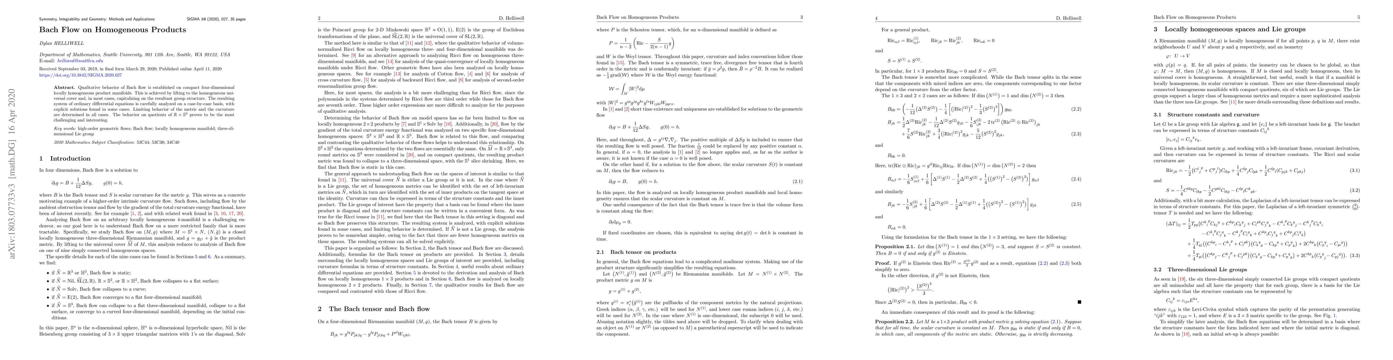 Qualitative behavior of Bach flow is established on compact four-dimensional locally homogeneous product manifolds. This is achieved by lifting to the homogeneous universal cover and, in most cases, capitalizing on the resultant group structure. The resulting system of ordinary differential equations is carefully analyzed on a case-by-case basis, with explicit solutions found in some cases. Limiting behavior of the metric and the curvature are determined in all cases. The behavior on quotients of $\mathbb{R} \times \mathbb{S}^3$ proves to be the most challenging and interesting.