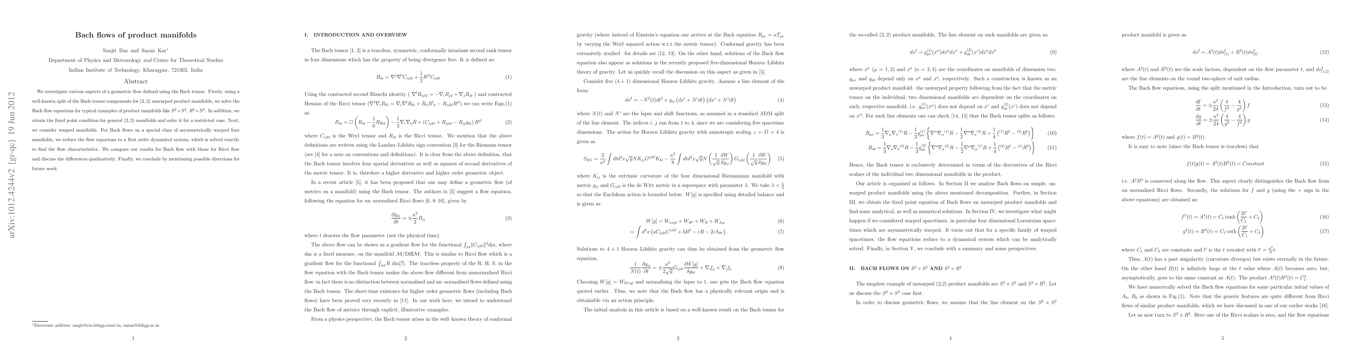 We investigate various aspects of a geometric flow defined using the Bach tensor. Firstly, using a well-known split of the Bach tensor components for $(2,2)$ unwarped product manifolds, we solve the Bach flow equations for typical examples of product manifolds like $S^2\times S^2$, $R^2\times S^2$. In addition, we obtain the fixed point condition for general $(2,2)$ manifolds and solve it for a restricted case. Next, we consider warped manifolds. For Bach flows on a special class of asymmetrically warped four manifolds, we reduce the flow equations to a first order dynamical system, which is solved exactly to find the flow characteristics. We compare our results for Bach flow with those for Ricci flow and discuss the differences qualitatively. Finally, we conclude by mentioning possible directions for future work.