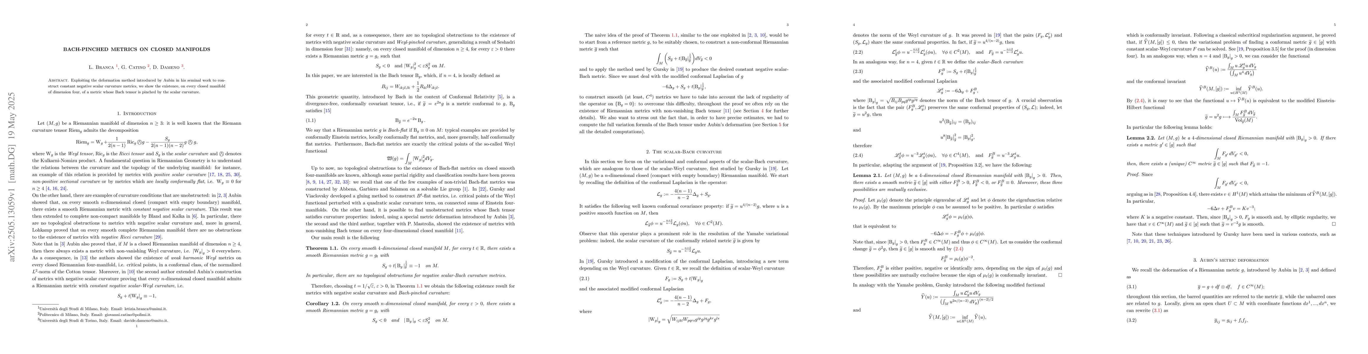 Researchers show that a specific type of metric exists on every closed 4-dimensional manifold, with its Bach tensor pinched by the scalar curvature. This contribution expands our understanding of constant negative scalar curvature metrics.