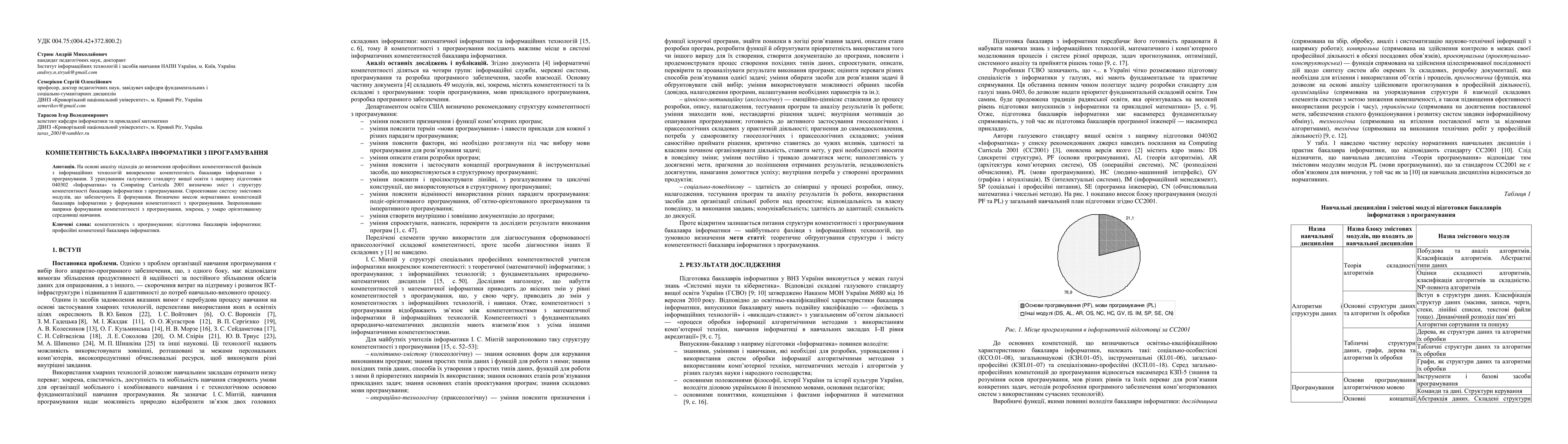 Based on the analysis of approaches to the definition of professional competencies of IT students the competence in programming of bachelor of informatics is proposed. Due to the standard of training in 040302 "Informatics" and Computing Curricula 2001 it was defined the content and structure of the competence in programming of bachelor of informatics. The system of content modules providing its formation was designed. The contribution of regulatory competencies of bachelor of informatics in the formation of competence in programming is defined. The directions of formation of competence in programming in the cloudy-oriented learning environment are proposed.