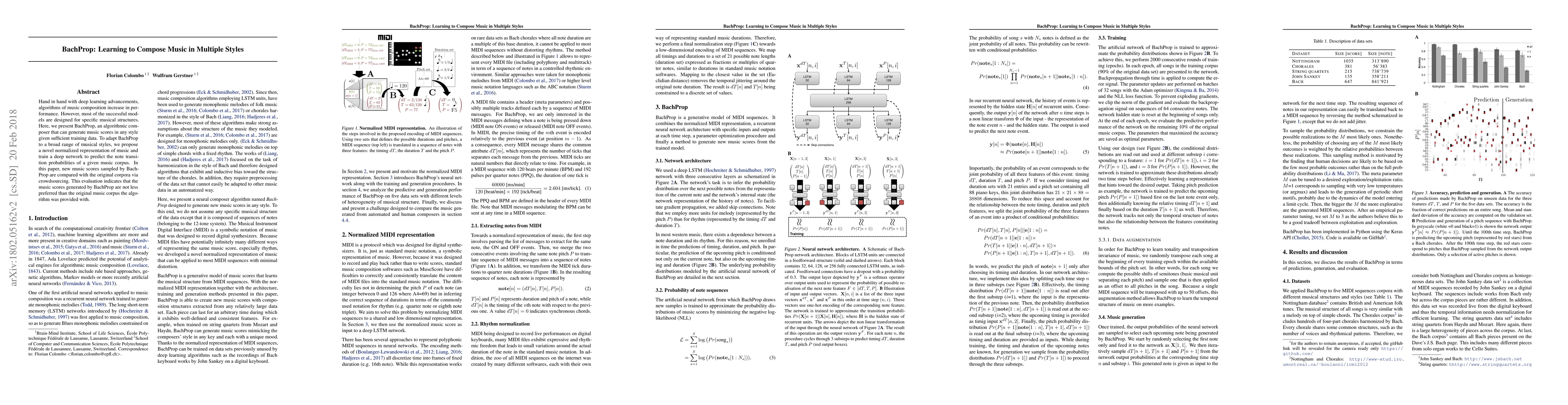 BachProp introduces a deep learning model capable of generating music in various styles by employing a normalized representation of music and predicting note transition probabilities. Evaluation through crowdsourcing reveals that BachProp-generated music scores are comparably preferred to the original training corpora.