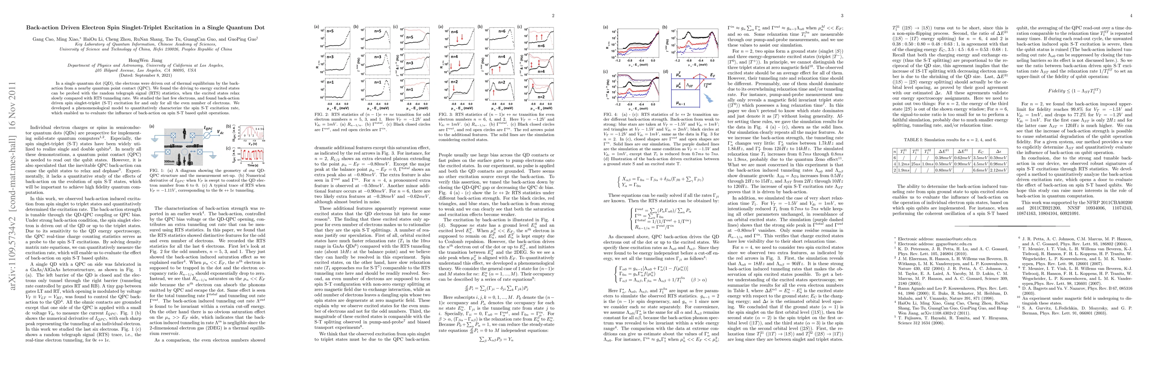 In a single quantum dot (QD), the electrons were driven out of thermal equilibrium by the back-action from a nearby quantum point contact (QPC). We found the driving to energy excited states can be probed with the random telegraph signal (RTS) statistics, when the excited states relax slowly compared with RTS tunneling rate. We studied the last few electrons, and found back-action driven spin singlet-triplet (S-T) excitation for and only for all the even number of electrons. We developed a phenomenological model to quantitatively characterize the spin S-T excitation rate, which enabled us to evaluate the influence of back-action on spin S-T based qubit operations.