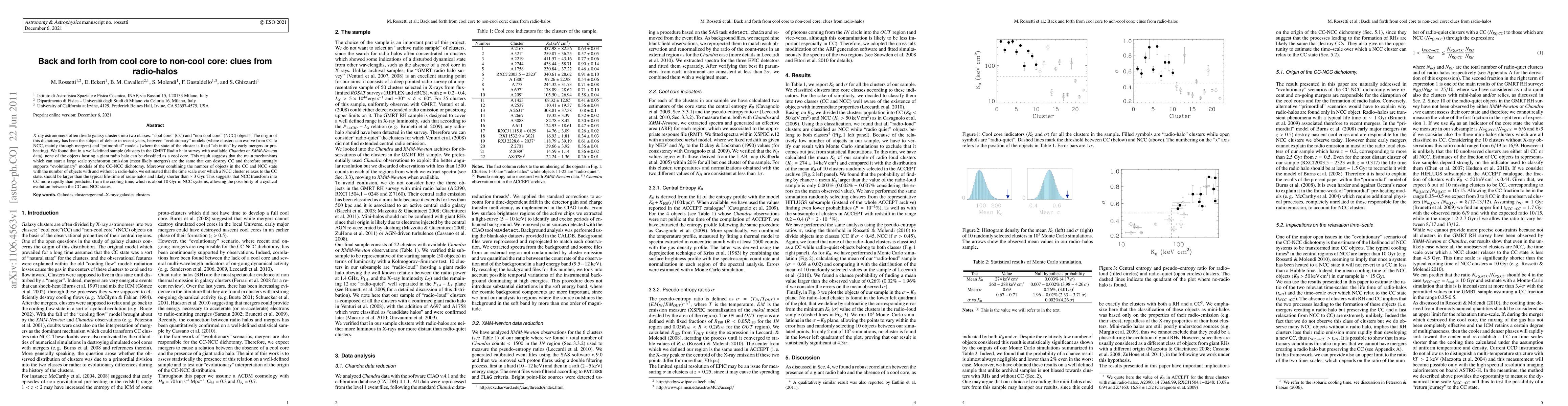 This study finds that galaxy clusters with giant radio halos cannot be classified as cool core, supporting evolutionary models over primordial ones for the cool core-non-cool core dichotomy. The research suggests that the transformation from non-cool core to cool core occurs faster than predicted, indicating a possible cyclical evolution between these states.