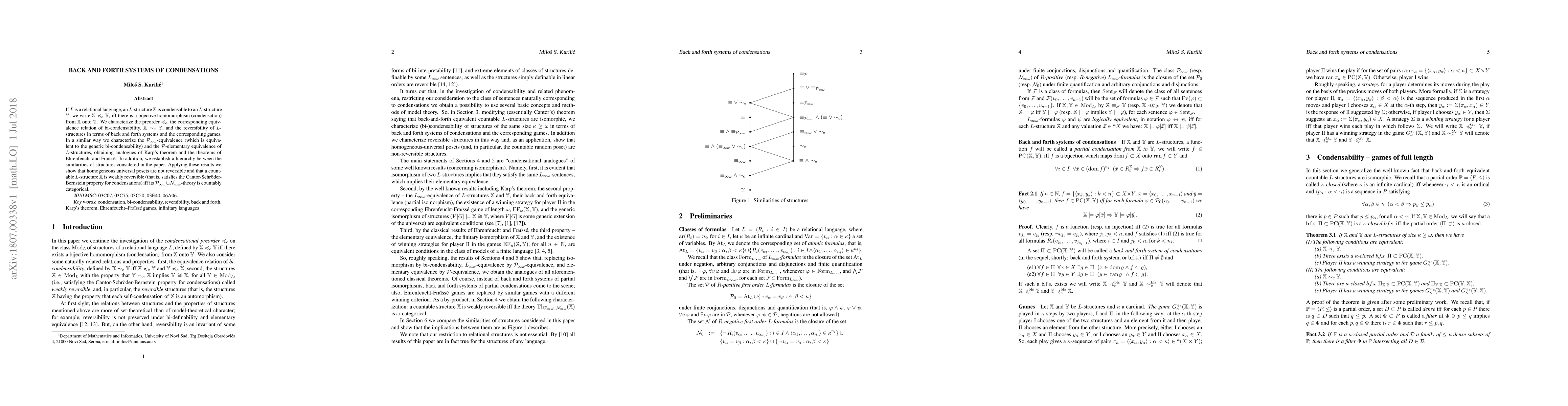 If $L$ is a relational language, an $L$-structure ${\mathbb X}$ is condensable to an $L$-structure ${\mathbb Y}$, we write ${\mathbb X} \preccurlyeq _c {\mathbb Y}$, iff there is a bijective homomorphism (condensation) from ${\mathbb X}$ onto ${\mathbb Y}$. We characterize the preorder $\preccurlyeq _c$, the corresponding equivalence relation of bi-condensability, ${\mathbb X} \sim _c {\mathbb Y}$, and the reversibility of $L$-structures in terms of back and forth systems and the corresponding games. In a similar way we characterize the ${\mathcal P}_{\infty \omega}$-equivalence (which is equivalent to the generic bi-condensability) and the ${\mathcal P}$-elementary equivalence of $L$-structures, obtaining analogues of Karp's theorem and the theorems of Ehrenfeucht and Fra\"iss\'e. In addition, we establish a hierarchy between the similarities of structures considered in the paper. Applying these results we show that homogeneous universal posets are not reversible and that a countable $L$-structure ${\mathbb X}$ is weakly reversible (that is, satisfies the Cantor-Schr\"oder-Bernstein property for condensations) iff its ${\mathcal P}_{\infty \omega}\cup {\mathcal N}_{\infty \omega}$-theory is countably categorical.