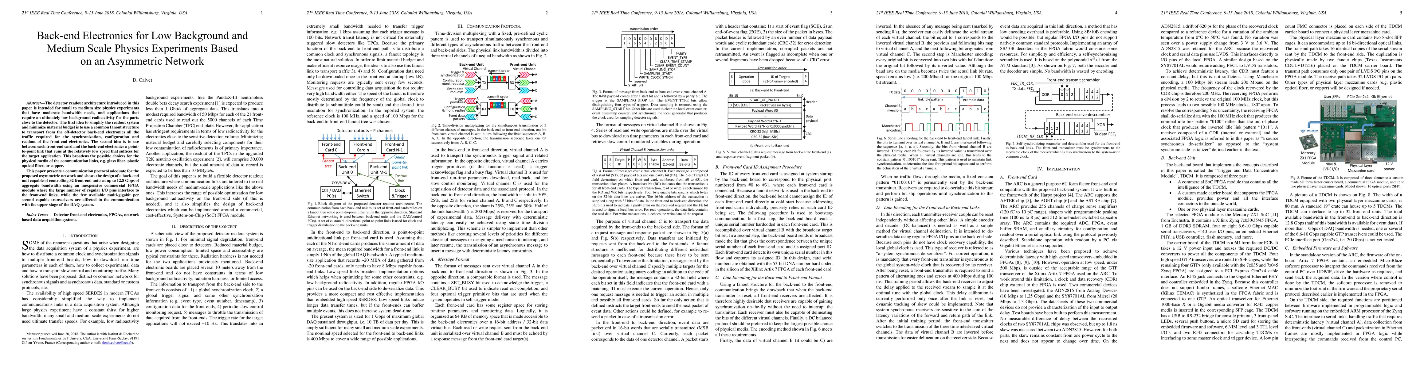 This paper proposes a back-end electronics architecture for low background, medium-scale physics experiments, utilizing an asymmetric network to minimize material and maximize low-background conditions. The design features a common fanout structure for synchronization and configuration, and point-to-point links for front-end communication, enabling diverse media choices and a protocol for the network.