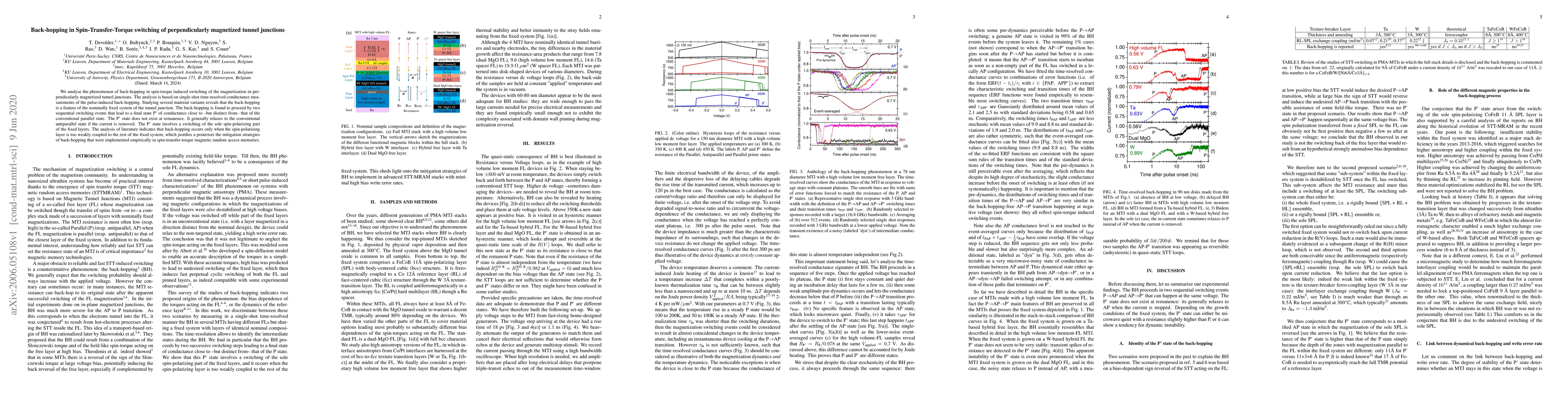 We analyse the phenomenon of back-hopping in spin-torque induced switching of the magnetization in perpendicularly magnetized tunnel junctions. The analysis is based on single-shot time-resolved conductance measurements of the pulse-induced back-hopping. Studying several material variants reveals that the back-hopping is a feature of the nominally fixed system of the tunnel junction. The back-hopping is found to proceed by two sequential switching events that lead to a final state P' of conductance close to --but distinct from-- that of the conventional parallel state. The P' state does not exist at remanence. It generally relaxes to the conventional antiparallel state if the current is removed. The P' state involves a switching of the sole spin-polarizing part of the fixed layers. The analysis of literature indicates that back-hopping occurs only when the spin-polarizing layer is too weakly coupled to the rest of the fixed system, which justifies a posteriori the mitigation strategies of back-hopping that were implemented empirically in spin-transfer-torque magnetic random access memories.