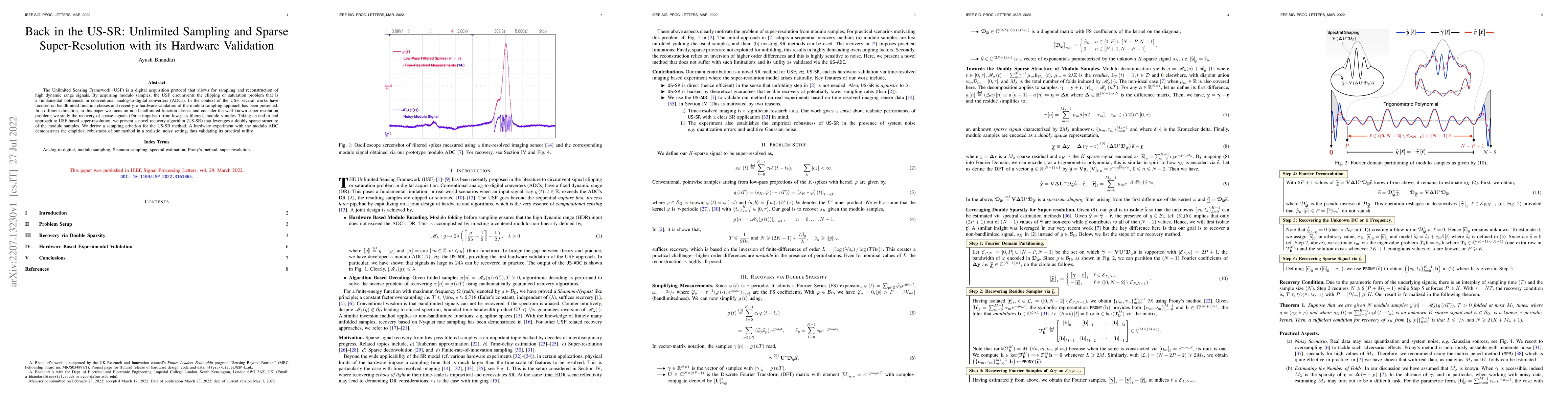 This paper introduces the Unlimited Sensing Framework (USF) for sampling and reconstructing high dynamic range signals, focusing on sparse super-resolution. It proposes a novel US-SR algorithm leveraging doubly sparse structures in modulo samples, validated through a hardware experiment demonstrating its robustness in noisy conditions.