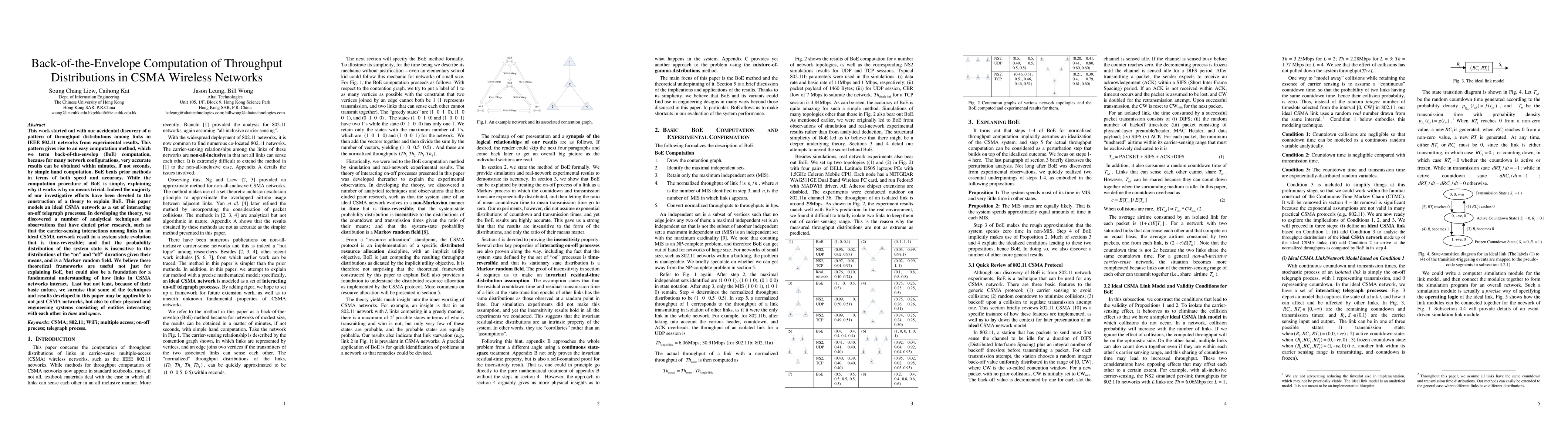 This work started out with our accidental discovery of a pattern of throughput distributions among links in IEEE 802.11 networks from experimental results. This pattern gives rise to an easy computation method, which we term back-of-the-envelop (BoE) computation, because for many network configurations, very accurate results can be obtained within minutes, if not seconds, by simple hand computation. BoE beats prior methods in terms of both speed and accuracy. While the computation procedure of BoE is simple, explaining why it works is by no means trivial. Indeed the majority of our investigative efforts have been devoted to the construction of a theory to explain BoE. This paper models an ideal CSMA network as a set of interacting on-off telegraph processes. In developing the theory, we discovered a number of analytical techniques and observations that have eluded prior research, such as that the carrier-sensing interactions among links in an ideal CSMA network result in a system state evolution that is time-reversible; and that the probability distribution of the system state is insensitive to the distributions of the "on" and "off" durations given their means, and is a Markov random field. We believe these theoretical frameworks are useful not just for explaining BoE, but could also be a foundation for a fundamental understanding of how links in CSMA networks interact. Last but not least, because of their basic nature, we surmise that some of the techniques and results developed in this paper may be applicable to not just CSMA networks, but also to other physical and engineering systems consisting of entities interacting with each other in time and space.