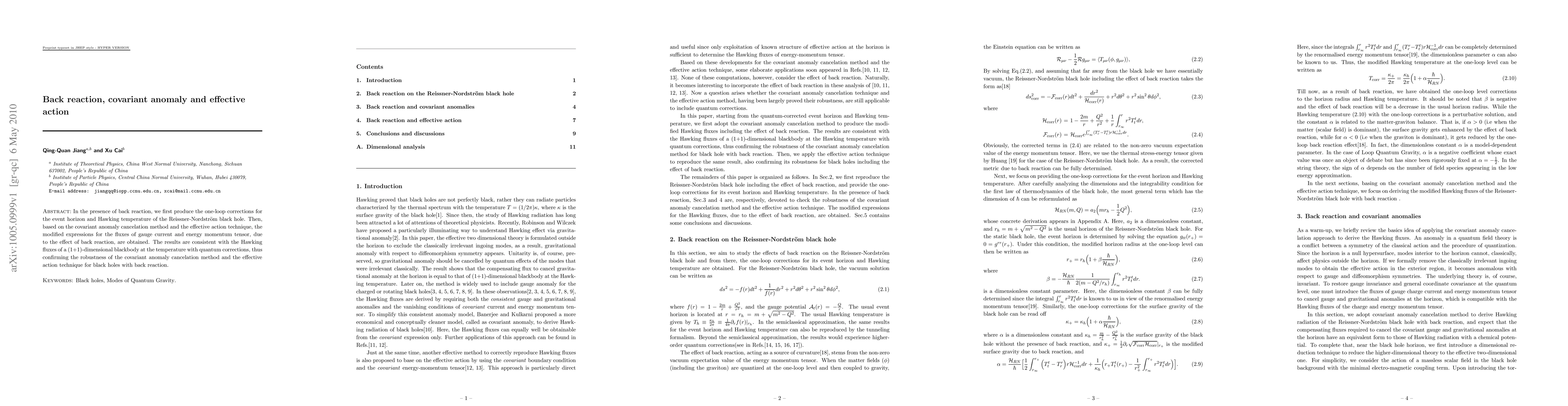This paper investigates one-loop corrections for the Reissner-Nordström black hole's event horizon and Hawking temperature, considering back reaction. It employs covariant anomaly cancelation and effective action techniques to derive modified expressions for gauge current and energy-momentum tensor fluxes, confirming the robustness of these methods for black holes with back reaction.