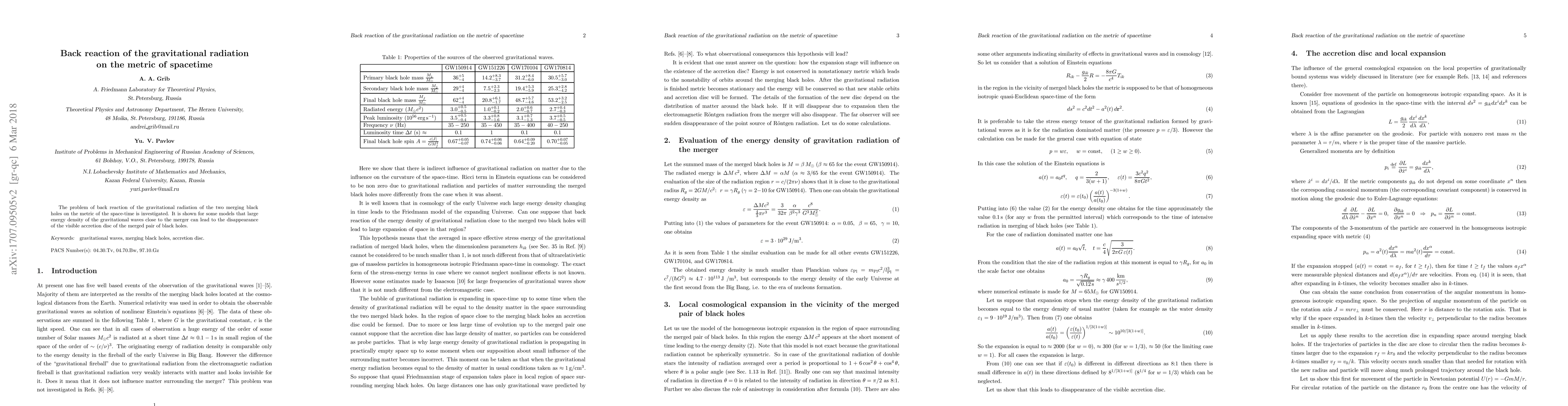 The problem of back reaction of the gravitational radiation of the two merging black holes on the metric of the spacetime is investigated. It is shown for some models that large energy density of the gravitational waves close to the merger can lead to the disappearance of the visible accretion disc of the merged pair of black holes.