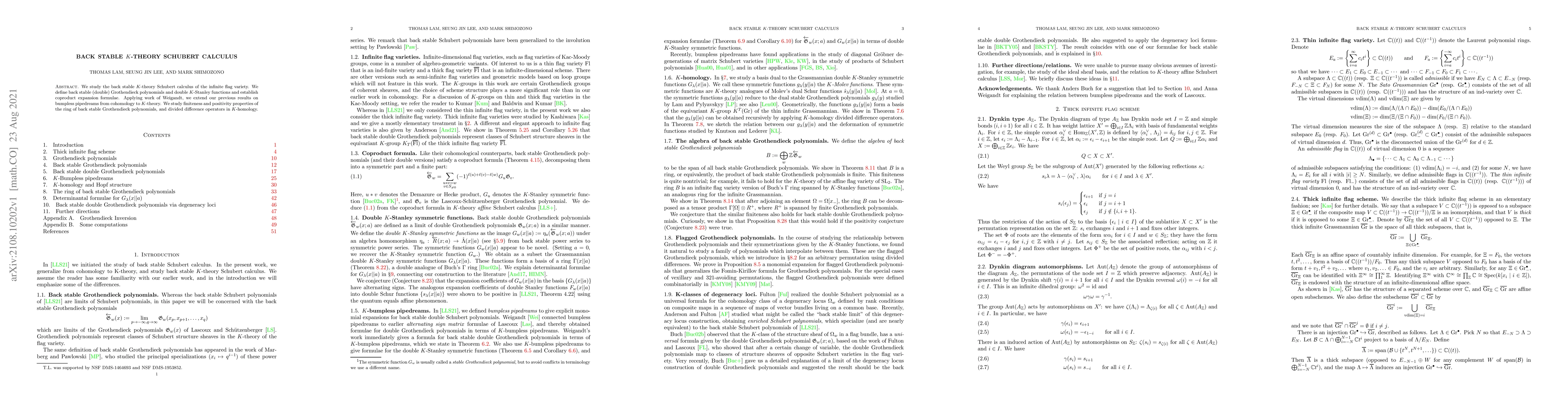 Summary: This paper investigates the back stable $K$-theory Schubert calculus on the infinite flag variety, defining back stable Grothendieck polynomials and double $K$-Stanley functions, and establishing coproduct expansion formulae. It extends previous results on bumpless pipedreams from cohomology to $K$-theory and examines the finiteness and positivity properties of the ring of these polynomials.
