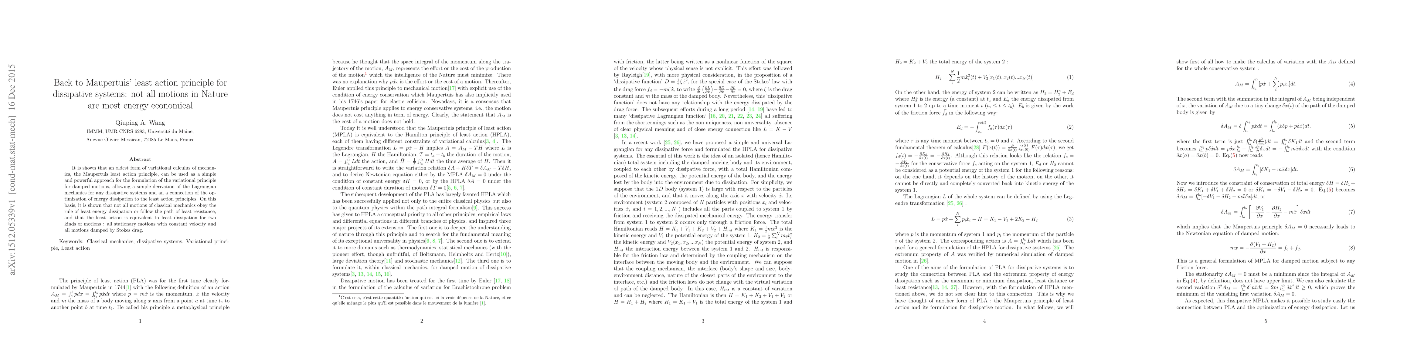Summary: The paper demonstrates that Maupertuis' least action principle can effectively describe variational principles for damped systems, revealing that not all natural motions follow the path of least energy dissipation. It highlights that least action corresponds to least dissipation only for stationary constant-velocity motions and those damped by Stokes drag.