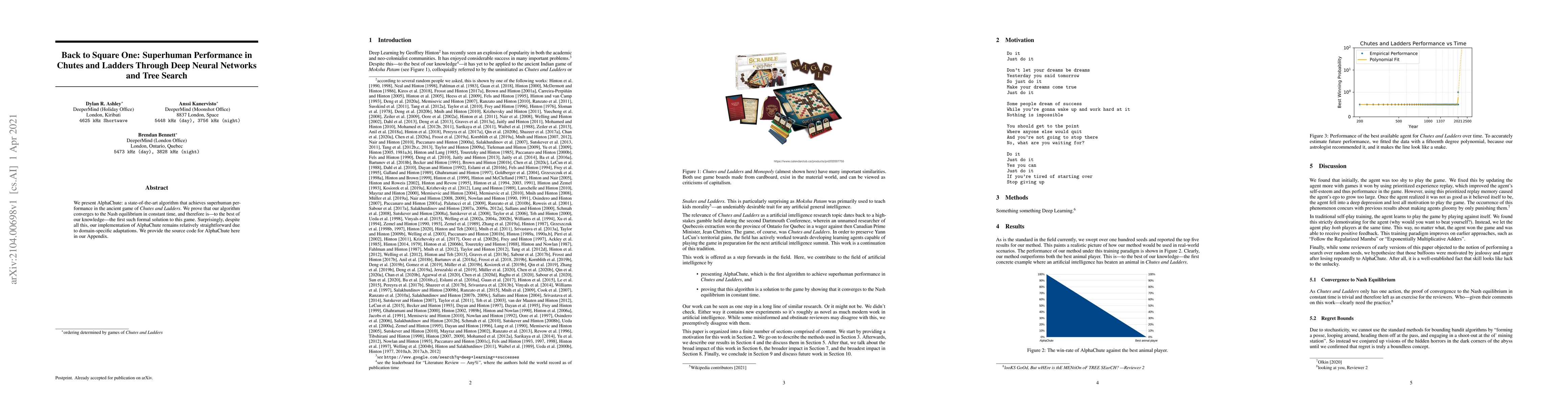 This paper introduces AlphaChute, a deep neural network and tree search algorithm achieving superhuman performance in Chutes and Ladders, proving convergence to the Nash equilibrium in constant time. Despite its theoretical complexity, the implementation remains straightforward through domain-specific adaptations.