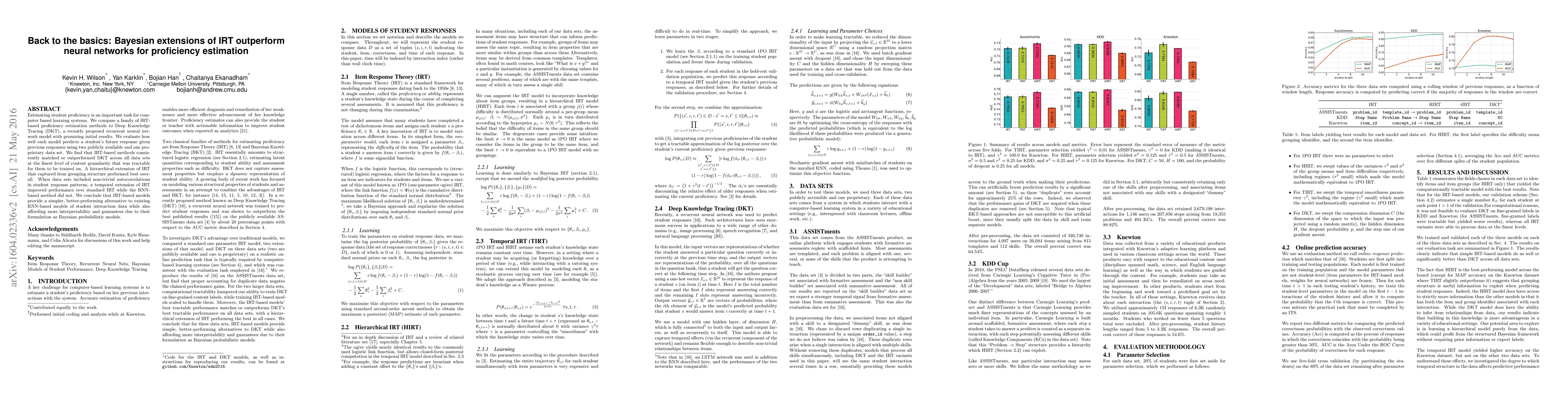 Estimating student proficiency is an important task for computer based learning systems. We compare a family of IRT-based proficiency estimation methods to Deep Knowledge Tracing (DKT), a recently proposed recurrent neural network model with promising initial results. We evaluate how well each model predicts a student's future response given previous responses using two publicly available and one proprietary data set. We find that IRT-based methods consistently matched or outperformed DKT across all data sets at the finest level of content granularity that was tractable for them to be trained on. A hierarchical extension of IRT that captured item grouping structure performed best overall. When data sets included non-trivial autocorrelations in student response patterns, a temporal extension of IRT improved performance over standard IRT while the RNN-based method did not. We conclude that IRT-based models provide a simpler, better-performing alternative to existing RNN-based models of student interaction data while also affording more interpretability and guarantees due to their formulation as Bayesian probabilistic models.