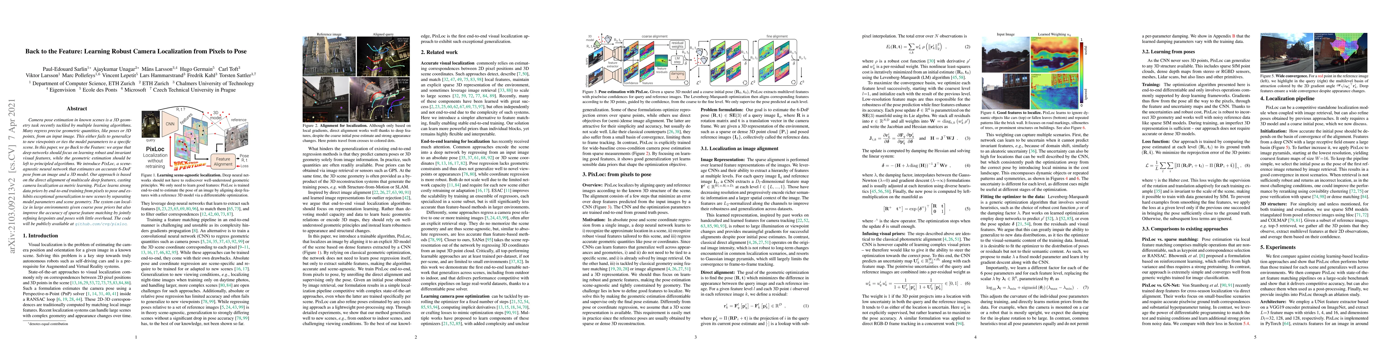 Camera pose estimation in known scenes is a 3D geometry task recently tackled by multiple learning algorithms. Many regress precise geometric quantities, like poses or 3D points, from an input image. This either fails to generalize to new viewpoints or ties the model parameters to a specific scene. In this paper, we go Back to the Feature: we argue that deep networks should focus on learning robust and invariant visual features, while the geometric estimation should be left to principled algorithms. We introduce PixLoc, a scene-agnostic neural network that estimates an accurate 6-DoF pose from an image and a 3D model. Our approach is based on the direct alignment of multiscale deep features, casting camera localization as metric learning. PixLoc learns strong data priors by end-to-end training from pixels to pose and exhibits exceptional generalization to new scenes by separating model parameters and scene geometry. The system can localize in large environments given coarse pose priors but also improve the accuracy of sparse feature matching by jointly refining keypoints and poses with little overhead. The code will be publicly available at https://github.com/cvg/pixloc.