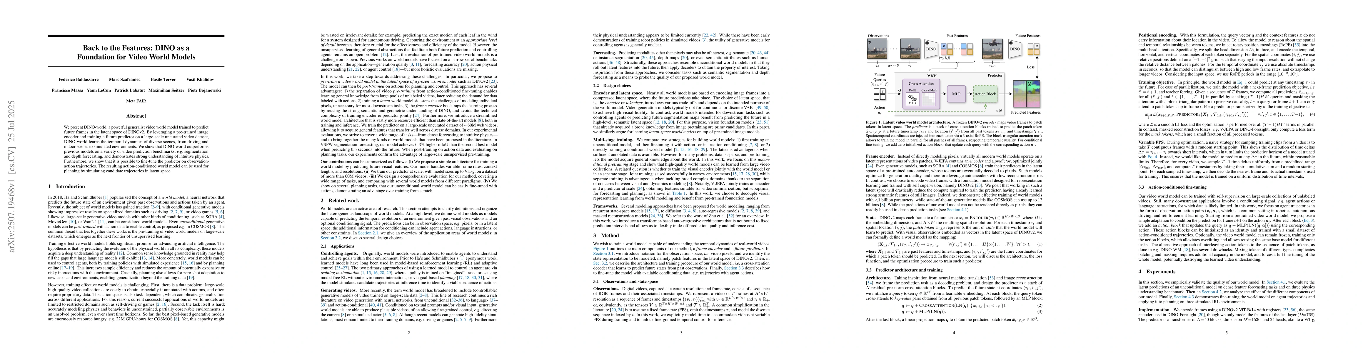 We present DINO-world, a powerful generalist video world model trained to predict future frames in the latent space of DINOv2. By leveraging a pre-trained image encoder and training a future predictor on a large-scale uncurated video dataset, DINO-world learns the temporal dynamics of diverse scenes, from driving and indoor scenes to simulated environments. We show that DINO-world outperforms previous models on a variety of video prediction benchmarks, e.g. segmentation and depth forecasting, and demonstrates strong understanding of intuitive physics. Furthermore, we show that it is possible to fine-tune the predictor on observation-action trajectories. The resulting action-conditioned world model can be used for planning by simulating candidate trajectories in latent space.