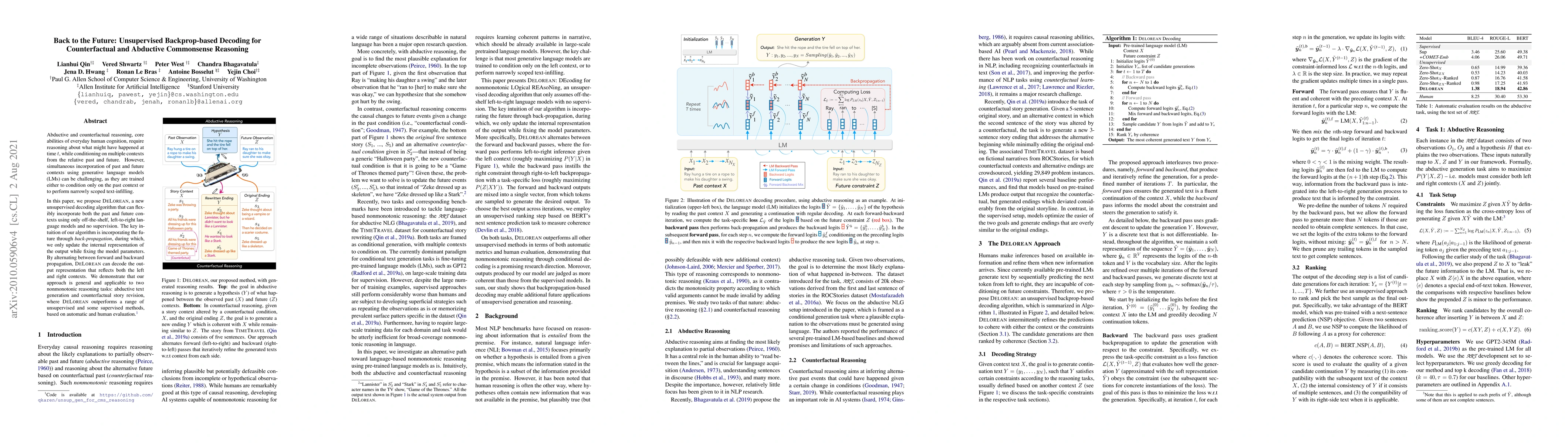 The paper introduces DeLorean, an unsupervised decoding algorithm that uses backpropagation to incorporate both past and future contexts in language models. This method outperforms other unsupervised and some supervised techniques in abductive text generation and counterfactual story revision tasks, demonstrating its effectiveness for nonmonotonic reasoning.