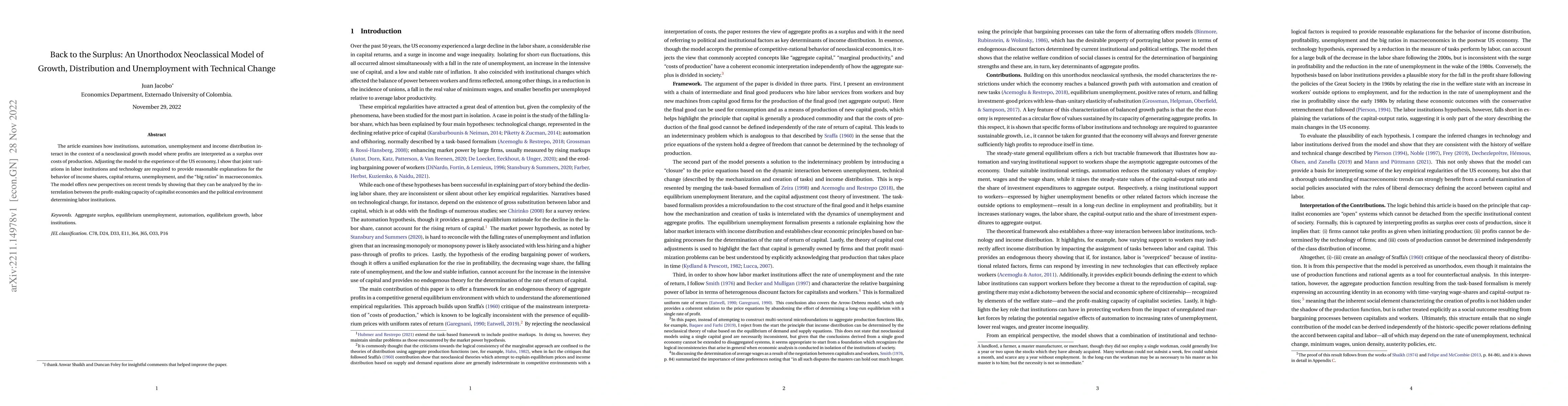 The article examines how institutions, automation, unemployment and income distribution interact in the context of a neoclassical growth model where profits are interpreted as a surplus over costs of production. Adjusting the model to the experience of the US economy, I show that joint variations in labor institutions and technology are required to provide reasonable explanations for the behavior of income shares, capital returns, unemployment, and the big ratios in macroeconomics. The model offers new perspectives on recent trends by showing that they can be analyzed by the interrelation between the profit-making capacity of capitalist economies and the political environment determining labor institutions.