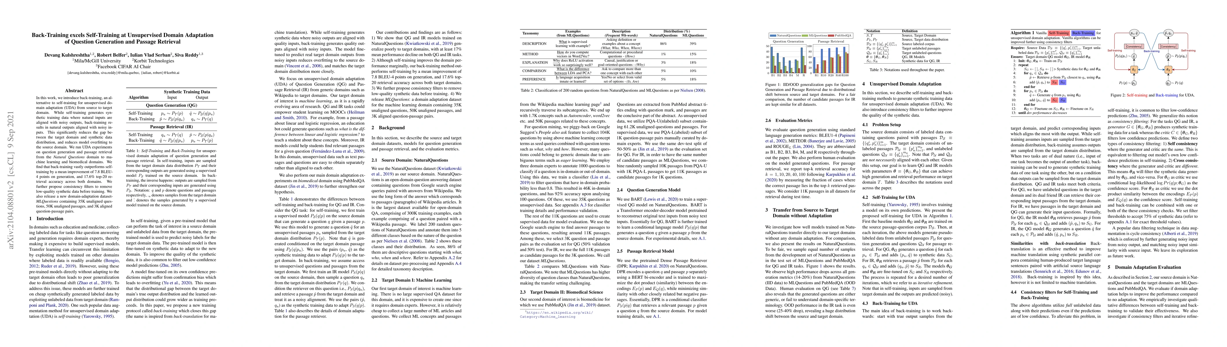In this work, we introduce back-training, an alternative to self-training for unsupervised domain adaptation (UDA) from source to target domain. While self-training generates synthetic training data where natural inputs are aligned with noisy outputs, back-training results in natural outputs aligned with noisy inputs. This significantly reduces the gap between the target domain and synthetic data distribution, and reduces model overfitting to the source domain. We run UDA experiments on question generation and passage retrieval from the \textit{Natural Questions} domain to machine learning and biomedical domains. We find that back-training vastly outperforms self-training by a mean improvement of 7.8 BLEU-4 points on generation, and 17.6\% top-20 retrieval accuracy across both domains. We further propose consistency filters to remove low-quality synthetic data before training. We also release a new domain-adaptation dataset- \textit{MLQuestions} containing 35K unaligned questions, 50K unaligned passages, and 3K aligned question-passage pairs.
