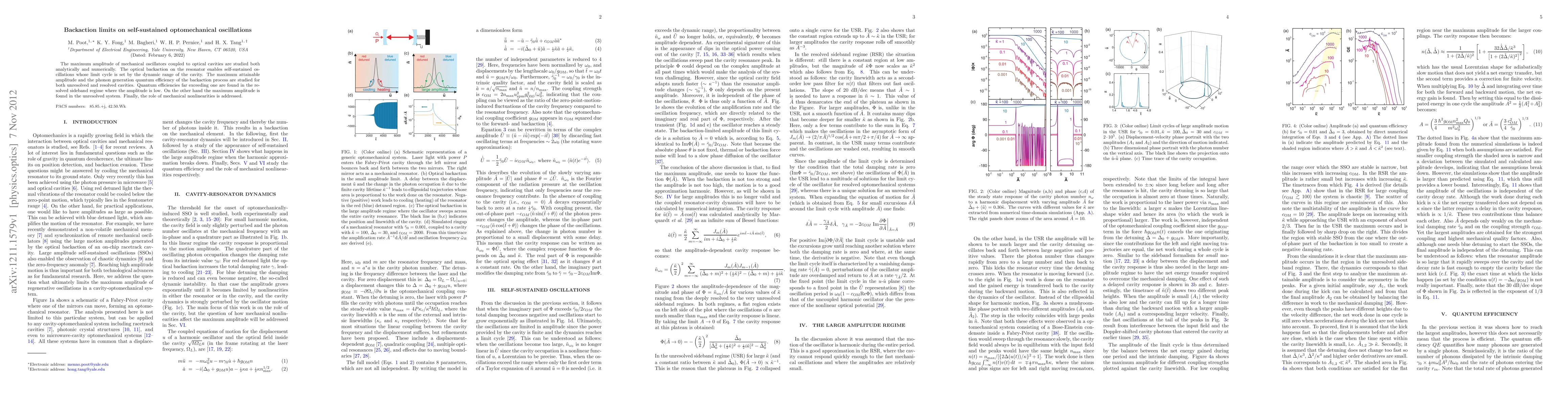 The maximum amplitude of mechanical oscillators coupled to optical cavities are studied both analytically and numerically. The optical backaction on the resonator enables self-sustained oscillations whose limit cycle is set by the dynamic range of the cavity. The maximum attainable amplitude and the phonon generation quantum efficiency of the backaction process are studied for both unresolved and resolved cavities. Quantum efficiencies far exceeding one are found in the resolved sideband regime where the amplitude is low. On the other hand the maximum amplitude is found in the unresolved system. Finally, the role of mechanical nonlinearities is addressed.