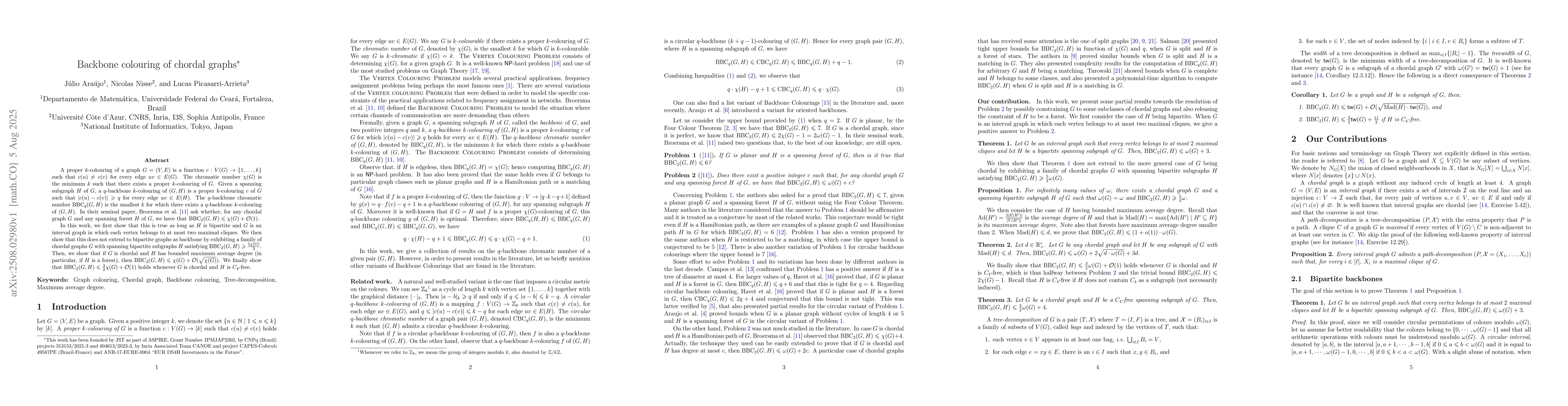 A proper $k$-colouring of a graph $G=(V,E)$ is a function $c: V(G)\to \{1,\ldots,k\}$ such that $c(u)\neq c(v)$ for every edge $uv\in E(G)$. The chromatic number $\chi(G)$ is the minimum $k$ such that there exists a proper $k$-colouring of $G$. Given a spanning subgraph $H$ of $G$, a $q$-backbone $k$-colouring of $(G,H)$ is a proper $k$-colouring $c$ of $G$ such that $\lvert c(u)-c(v)\rvert \ge q$ for every edge $uv\in E(H)$. The $q$-backbone chromatic number ${\rm BBC}_q(G,H)$ is the smallest $k$ for which there exists a $q$-backbone $k$-colouring of $(G,H)$. In their seminal paper, Broersma et al.~\cite{BFGW07} ask whether, for any chordal graph $G$ and any spanning forest $H$ of $G$, we have that ${\rm BBC}_2(G,H)\leq \chi(G)+O(1)$. In this work, we first show that this is true as long as $H$ is bipartite and $G$ is an interval graph in which each vertex belongs to at most two maximal cliques. We then show that this does not extend to bipartite graphs as backbone by exhibiting a family of chordal graphs $G$ with spanning bipartite subgraphs $H$ satisfying ${\rm BBC}_2(G,H)\geq \frac{5\chi(G)}{3}$. Then, we show that if $G$ is chordal and $H$ has bounded maximum average degree (in particular, if $H$ is a forest), then ${\rm BBC}_2(G,H)\leq \chi(G)+O(\sqrt{\chi(G)})$. We finally show that ${\rm BBC}_2(G,H)\leq \frac{3}{2}\chi(G)+O(1)$ holds whenever $G$ is chordal and $H$ is $C_4$-free.
