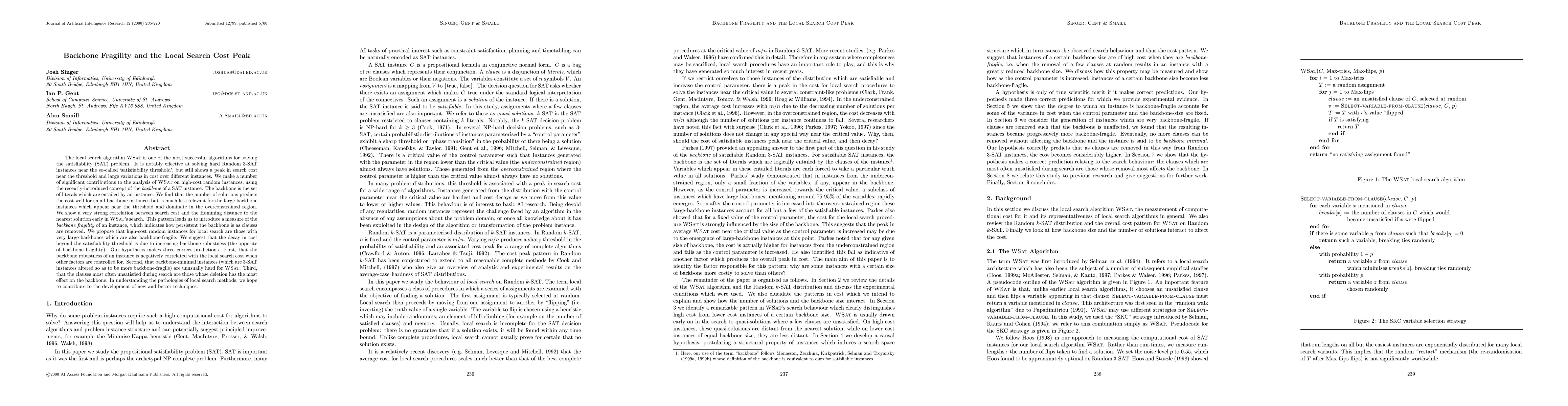 This research investigates the performance of WSat, a successful SAT-solving algorithm, near the 'satisfiability threshold'. Findings suggest that while the number of solutions predicts search cost for small-backbone instances, it's less relevant for high-cost, large-backbone instances near the threshold. The paper introduces 'backbone fragility' to explain high search costs for such instances, proposing that cost decay beyond the threshold is due to increasing backbone robustness. The hypothesis correctly predicts three phenomena: negative correlation between backbone robustness and local search cost, hardness of backbone-minimal instances for WSat, and the frequent unsatisfaction of clauses affecting the backbone during search.