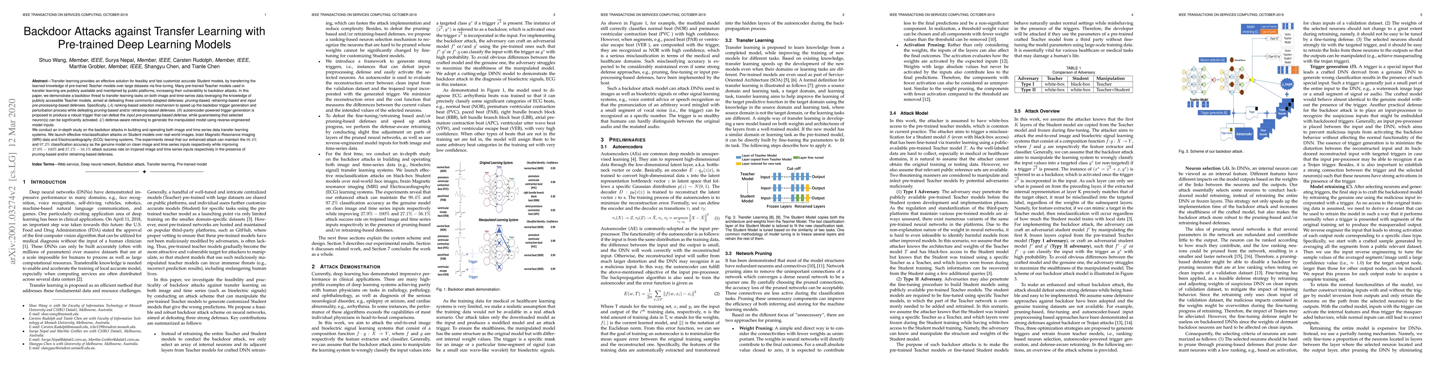 This paper investigates backdoor attacks against transfer learning using pre-trained deep learning models, demonstrating successful attacks on image and time-series data that bypass three common defenses: pruning-based, retraining-based, and input pre-processing-based. The enhanced attack maintains high classification accuracy while significantly increasing attack success rates.