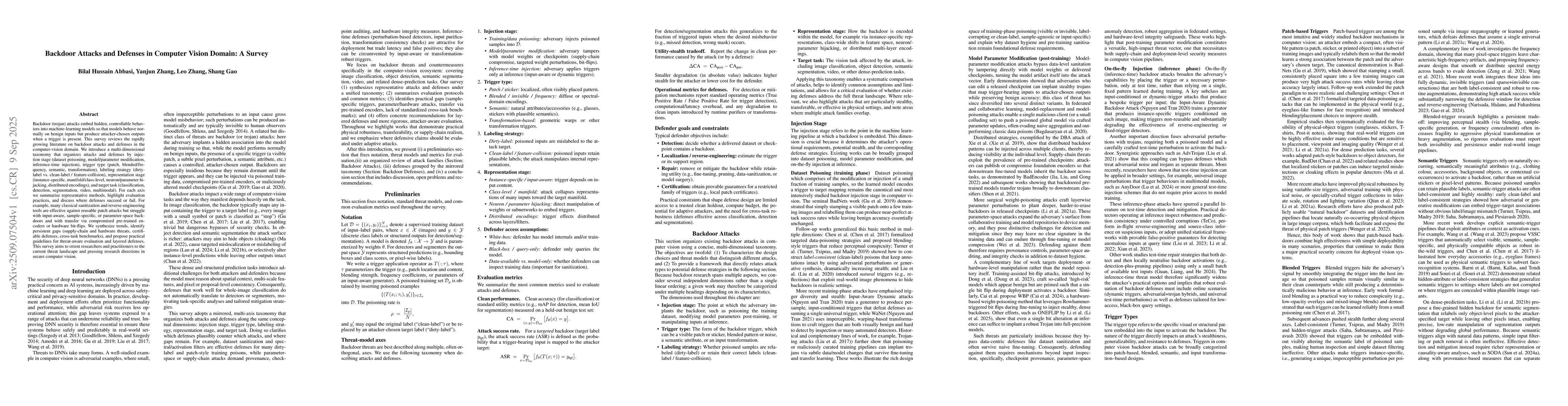 Backdoor (trojan) attacks embed hidden, controllable behaviors into machine-learning models so that models behave normally on benign inputs but produce attacker-chosen outputs when a trigger is present. This survey reviews the rapidly growing literature on backdoor attacks and defenses in the computer-vision domain. We introduce a multi-dimensional taxonomy that organizes attacks and defenses by injection stage (dataset poisoning, model/parameter modification, inference-time injection), trigger type (patch, blended/frequency, semantic, transformation), labeling strategy (dirty-label vs. clean-label / feature-collision), representation stage (instance-specific, manifold/class-level, neuron/parameter hijacking, distributed encodings), and target task (classification, detection, segmentation, video, multimodal). For each axis we summarize representative methods, highlight evaluation practices, and discuss where defenses succeed or fail. For example, many classical sanitization and reverse-engineering tools are effective against reusable patch attacks but struggle with input-aware, sample-specific, or parameter-space backdoors and with transfer via compromised pre-trained encoders or hardware bit-flips. We synthesize trends, identify persistent gaps (supply-chain and hardware threats, certifiable defenses, cross-task benchmarks), and propose practical guidelines for threat-aware evaluation and layered defenses. This survey aims to orient researchers and practitioners to the current threat landscape and pressing research directions in secure computer vision.