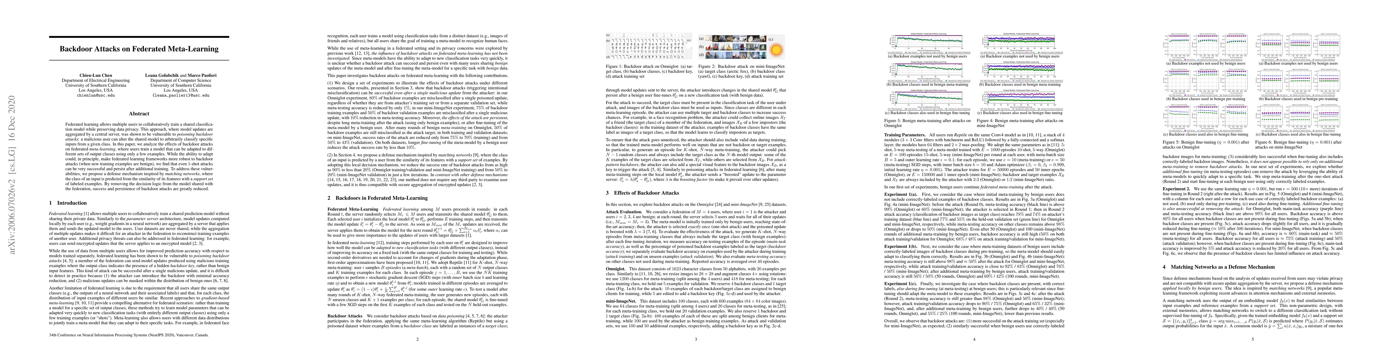 This paper investigates how backdoor attacks affect federated meta-learning, revealing that even minimal attacks can persist despite the model's adaptability. To counter these vulnerabilities, the authors propose a defense mechanism based on matching networks that significantly reduces the success and persistence of such attacks.