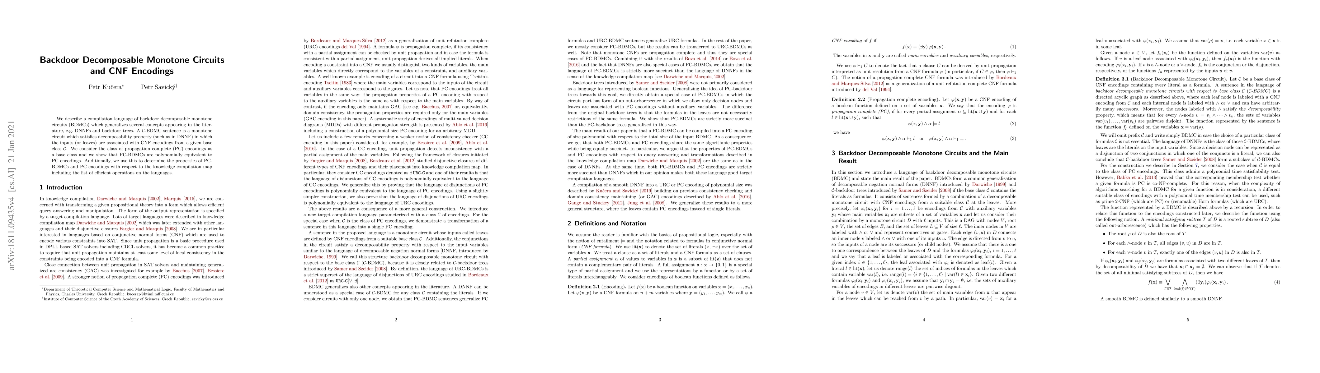 This paper introduces a compilation language for backdoor decomposable monotone circuits (BDMCs) that generalizes concepts like DNNFs and backdoor trees. It demonstrates that propagation complete (PC) BDMCs are polynomially equivalent to PC encodings, and explores their properties and efficient operations within knowledge compilation.