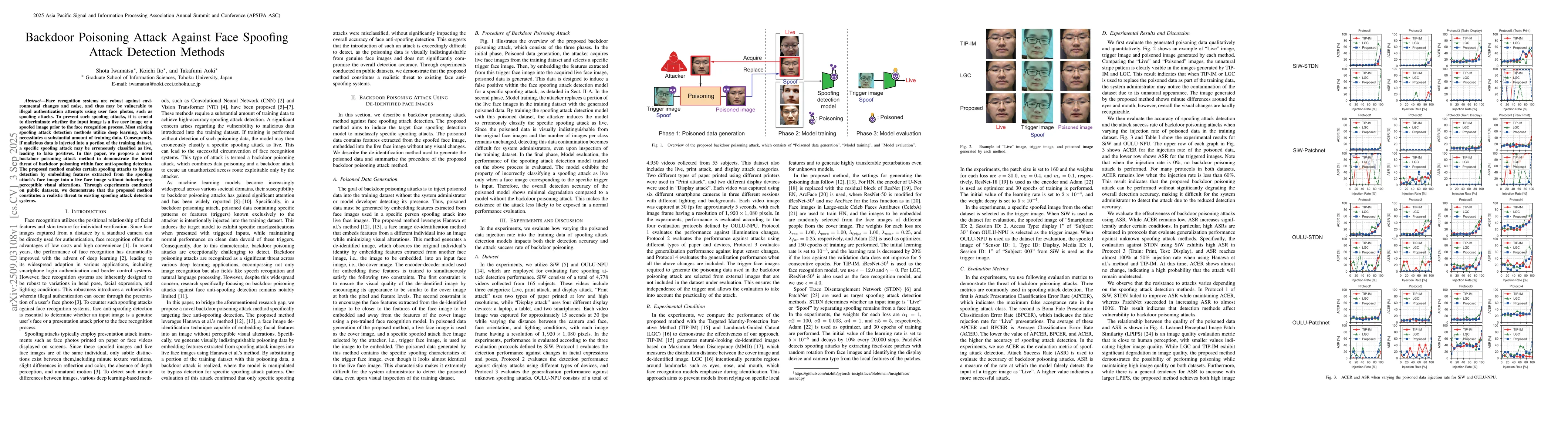 Face recognition systems are robust against environmental changes and noise, and thus may be vulnerable to illegal authentication attempts using user face photos, such as spoofing attacks. To prevent such spoofing attacks, it is crucial to discriminate whether the input image is a live user image or a spoofed image prior to the face recognition process. Most existing spoofing attack detection methods utilize deep learning, which necessitates a substantial amount of training data. Consequently, if malicious data is injected into a portion of the training dataset, a specific spoofing attack may be erroneously classified as live, leading to false positives.In this paper, we propose a novel backdoor poisoning attack method to demonstrate the latent threat of backdoor poisoning within face anti-spoofing detection. The proposed method enables certain spoofing attacks to bypass detection by embedding features extracted from the spoofing attack's face image into a live face image without inducing any perceptible visual alterations.Through experiments conducted on public datasets, we demonstrate that the proposed method constitutes a realistic threat to existing spoofing attack detection systems.