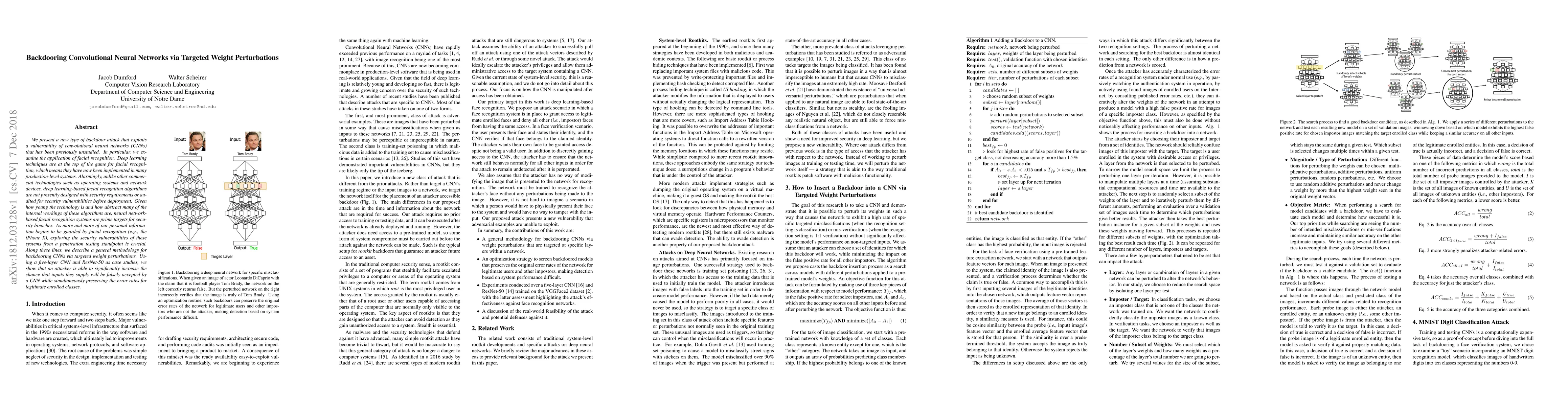 This paper introduces a novel backdoor attack method targeting convolutional neural networks (CNNs), specifically focusing on facial recognition systems. The authors demonstrate how targeted weight perturbations can be used to increase the likelihood of false acceptances while maintaining error rates for legitimate users, highlighting the security vulnerabilities in current deployment practices.