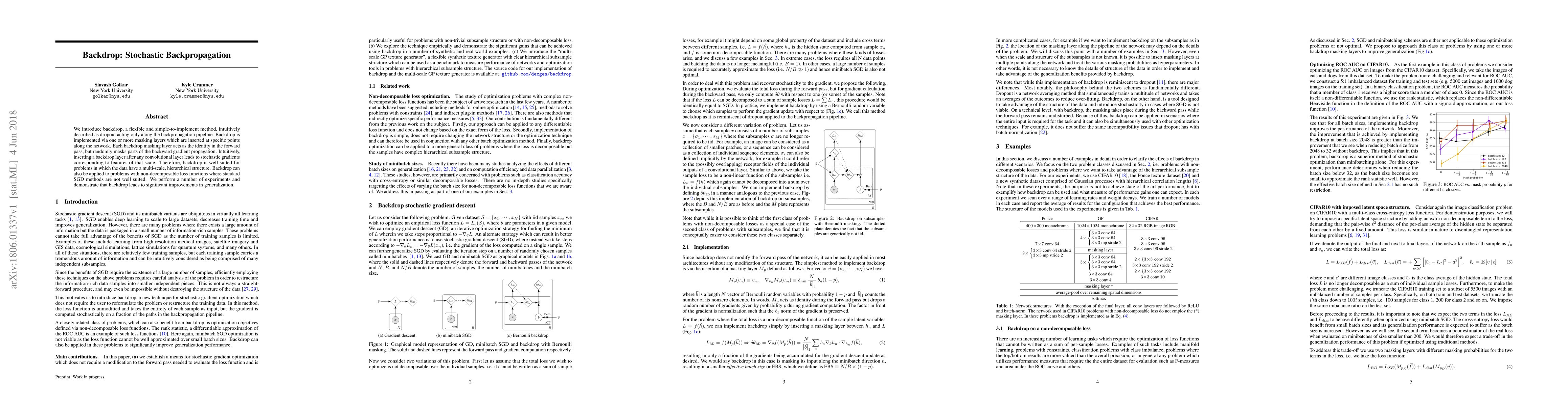 We introduce backdrop, a flexible and simple-to-implement method, intuitively described as dropout acting only along the backpropagation pipeline. Backdrop is implemented via one or more masking layers which are inserted at specific points along the network. Each backdrop masking layer acts as the identity in the forward pass, but randomly masks parts of the backward gradient propagation. Intuitively, inserting a backdrop layer after any convolutional layer leads to stochastic gradients corresponding to features of that scale. Therefore, backdrop is well suited for problems in which the data have a multi-scale, hierarchical structure. Backdrop can also be applied to problems with non-decomposable loss functions where standard SGD methods are not well suited. We perform a number of experiments and demonstrate that backdrop leads to significant improvements in generalization.