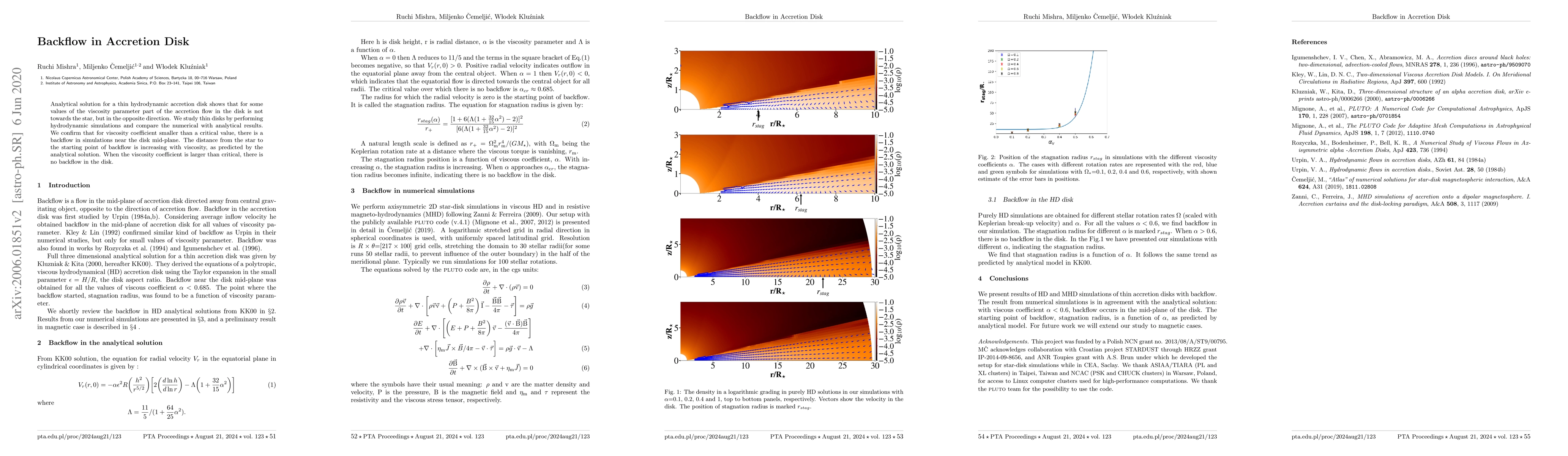 The research confirms the analytical solution for thin hydrodynamic accretion disks with backflow and provides numerical evidence for the critical value of viscosity.