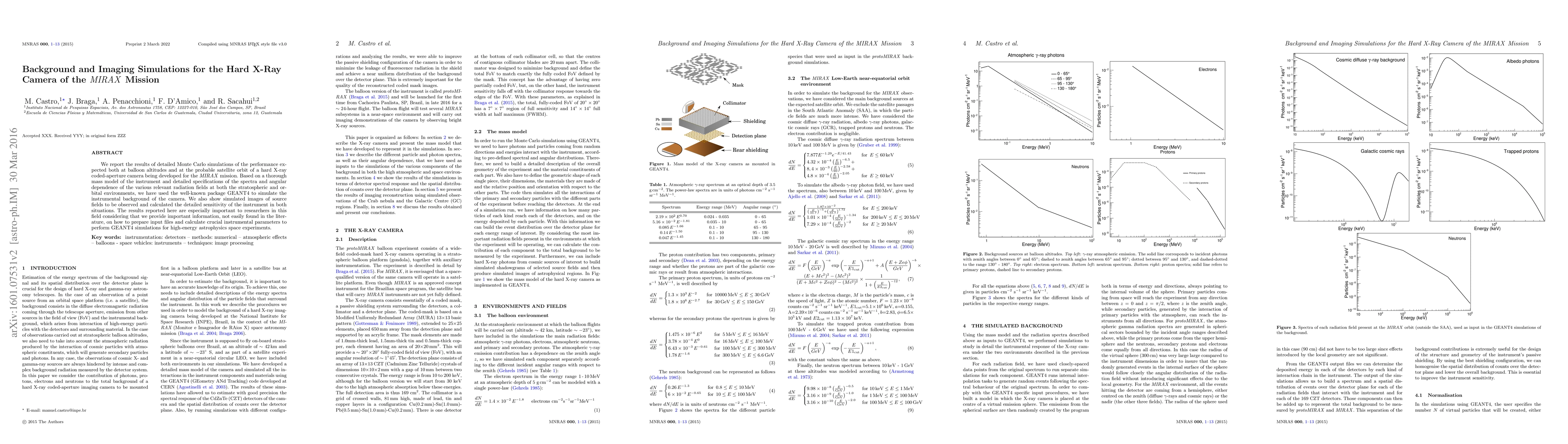 This paper presents Monte Carlo simulations using GEANT4 to evaluate the performance of a hard X-ray coded-aperture camera for the MIRAX mission, detailing instrumental background and sensitivity at both balloon and satellite orbits. It also provides valuable guidance on preparing input files and calculating crucial parameters for high-energy astrophysics simulations.
