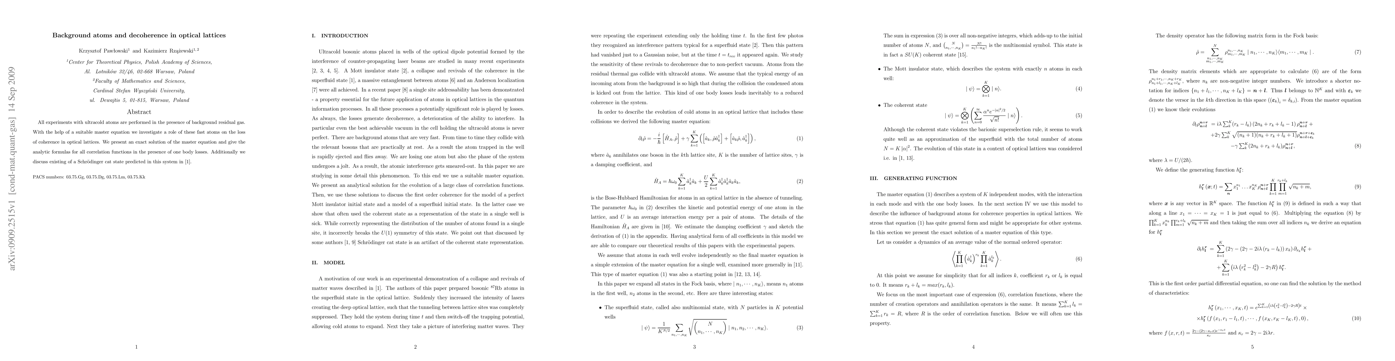 This paper investigates the impact of background residual gas atoms on coherence loss in optical lattices using a master equation. It provides an exact solution and analytic formulas for correlation functions in the presence of one-body losses, and discusses the existence of a Schrödinger cat state in the system.