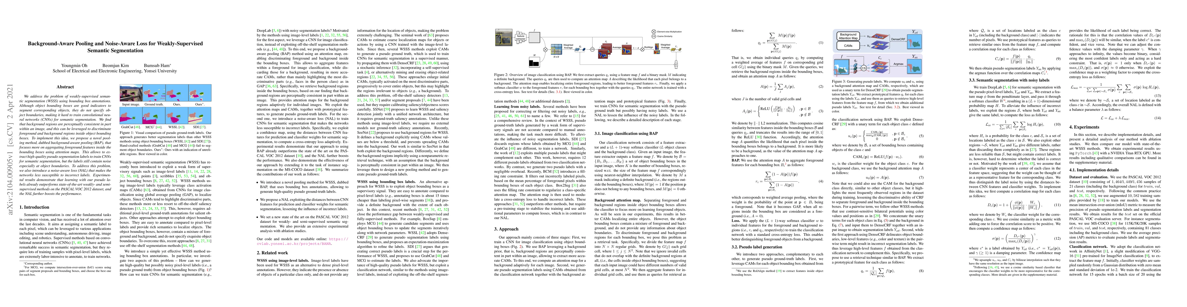 This paper proposes background-aware pooling (BAP) and a noise-aware loss (NAL) to enhance weakly-supervised semantic segmentation using bounding box annotations. The BAP method leverages consistent background regions to improve feature aggregation within object boxes, while the NAL reduces susceptibility to noisy pseudo labels, achieving superior performance on the PASCAL VOC 2012 dataset.