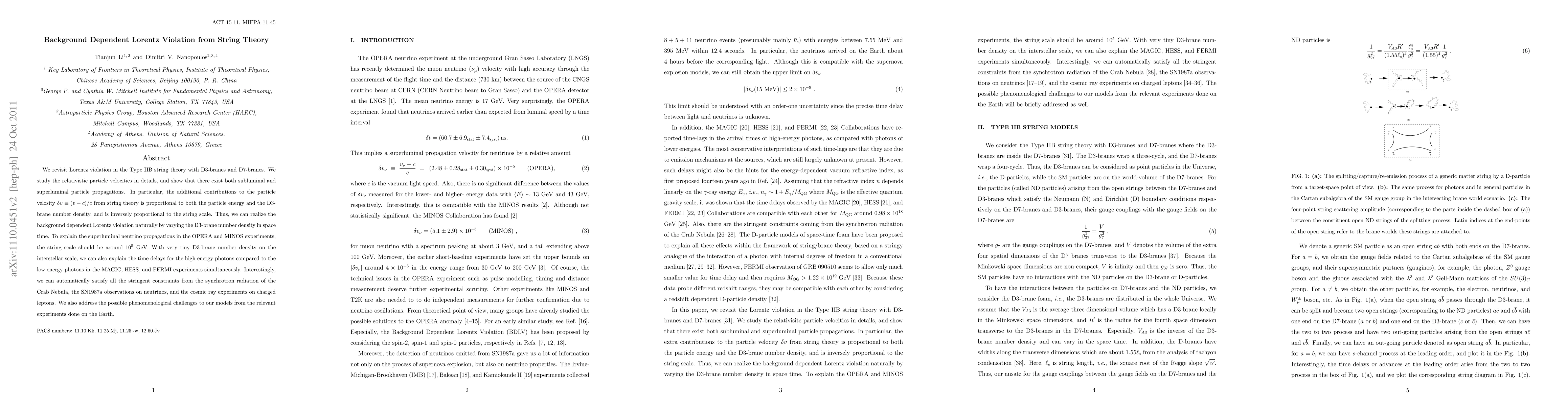 We revisit Lorentz violation in the Type IIB string theory with D3-branes and D7-branes. We study the relativistic particle velocities in details, and show that there exist both subluminal and superluminal particle propagations. In particular, the additional contributions to the particle velosity \delta v\equiv (v-c)/c from string theory is proportional to both the particle energy and the D3-brane number density, and is inversely proportional to the string scale. Thus, we can realize the background dependent Lorentz violation naturally by varying the D3-brane number density in space time. To explain the superluminal neutrino propagations in the OPERA and MINOS experiments, the string scale should be around 10^5 GeV. With very tiny D3-brane number density on the interstellar scale, we can also explain the time delays for the high energy photons compared to the low energy photons in the MAGIC, HESS, and FERMI experiments simultaneously. Interestingly, we can automatically satisfy all the stringent constraints from the synchrotron radiation of the Crab Nebula, the SN1987a observations on neutrinos, and the cosmic ray experiments on charged leptons. We also address the possible phenomenological challenges to our models from the relevant experiments done on the Earth.