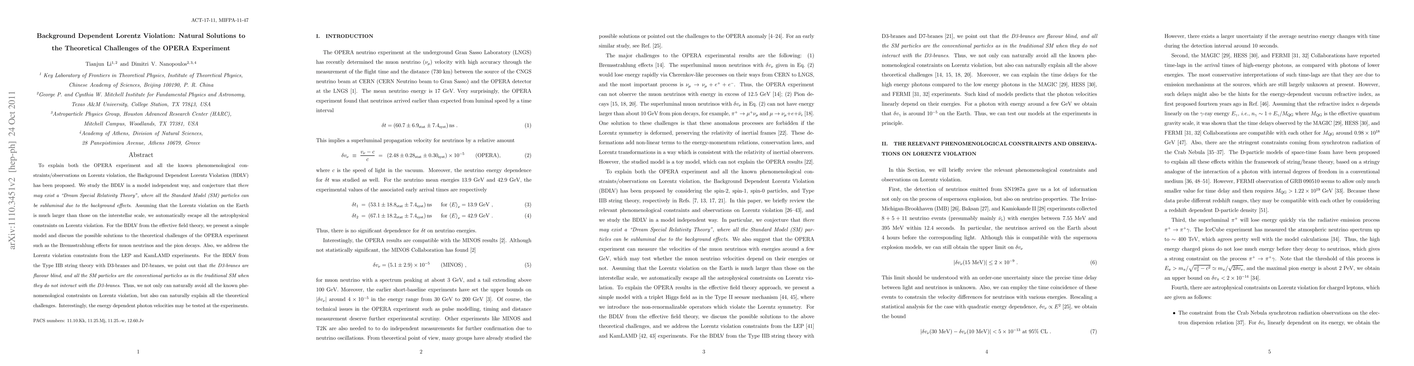 To explain both the OPERA experiment and all the known phenomenological constraints/observations on Lorentz violation, the Background Dependent Lorentz Violation (BDLV) has been proposed. We study the BDLV in a model independent way, and conjecture that there may exist a "Dream Special Relativity Theory", where all the Standard Model (SM) particles can be subluminal due to the background effects. Assuming that the Lorentz violation on the Earth is much larger than those on the interstellar scale, we automatically escape all the astrophysical constraints on Lorentz violation. For the BDLV from the effective field theory, we present a simple model and discuss the possible solutions to the theoretical challenges of the OPERA experiment such as the Bremsstrahlung effects for muon neutrinos and the pion decays. Also, we address the Lorentz violation constraints from the LEP and KamLAMD experiments. For the BDLV from the Type IIB string theory with D3-branes and D7-branes, we point out that the D3-branes are flavour blind, and all the SM particles are the conventional particles as in the traditional SM when they do not interact with the D3-branes. Thus, we not only can naturally avoid all the known phenomenological constraints on Lorentz violation, but also can naturally explain all the theoretical challenges. Interestingly, the energy dependent photon velocities may be tested at the experiments.