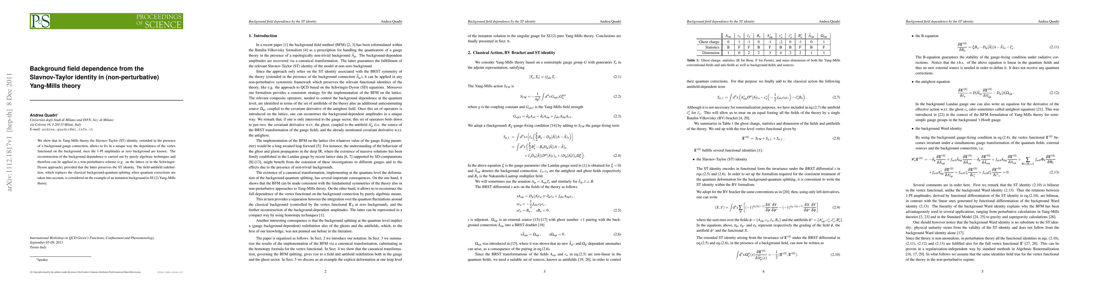 We show that in Yang-Mills theory the Slavnov-Taylor (ST) identity, extended in the presence of a background gauge connection, allows to fix in a unique way the dependence of the vertex functional on the background, once the 1-PI amplitudes at zero background are known. The reconstruction of the background dependence is carried out by purely algebraic techniques and therefore can be applied in a non-perturbative scheme (e.g. on the lattice or in the Schwinger-Dyson approach), provided that the latter preserves the ST identity. The field-antifield redefinition, which replaces the classical background-quantum splitting when quantum corrections are taken into account, is considered on the example of an instanton background in SU(2) Yang-Mills theory.